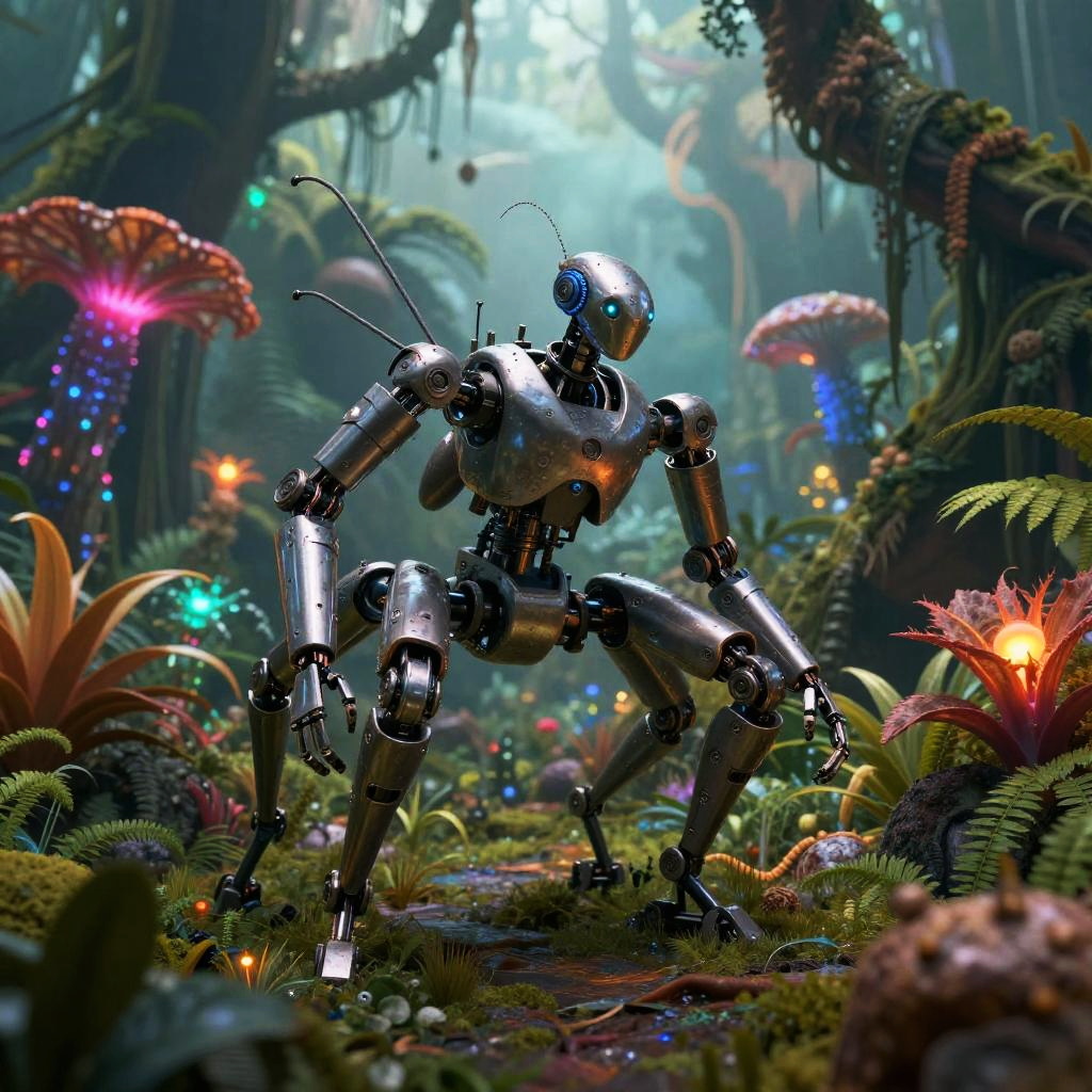 Photorealistic CGI: Silver robot with antennae stands in vibrant, enchanted forest, surrounded by glowing mushrooms, colorful flora, and lush greenery.