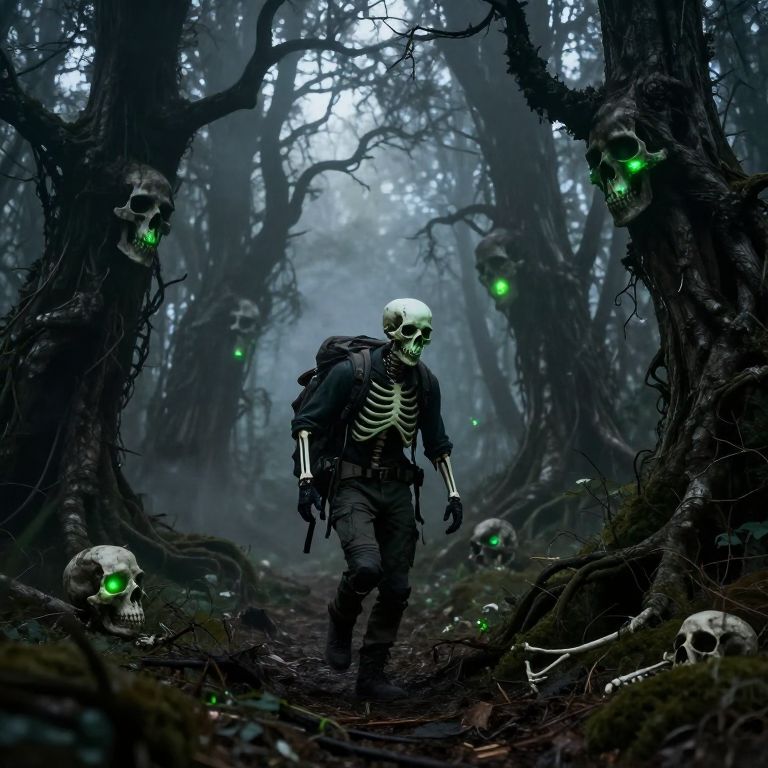 Skeltal explorer trekking through a dense haunted forest, bones reflecting faint green bioluminescent light, twisted trees with faces, thick fog enveloping the scene, eerie yet adventurous atmosphere, high detail and dramatic contrast.