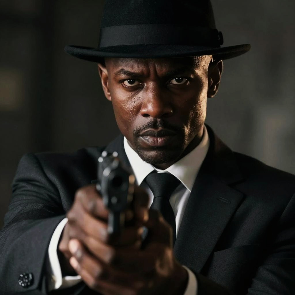 This is a dramatic, close-up shot of a serious-looking Black man in a dark, noir-style scene. He's wearing a black hat and suit, with a white shirt and black tie. He's holding a gun in his right hand, pointed forward, with a determined expression on his face. The background is dark and blurry, focusing all attention on his intense gaze and the gun. The lighting highlights his facial features and the sheen of sweat on his forehead.