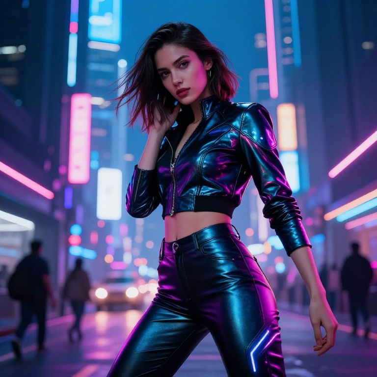 Ksenia Fedorova in a dynamic urban scene, neon lights, futuristic city background, confident pose, stylish outfit, vibrant colors, cyberpunk aesthetic