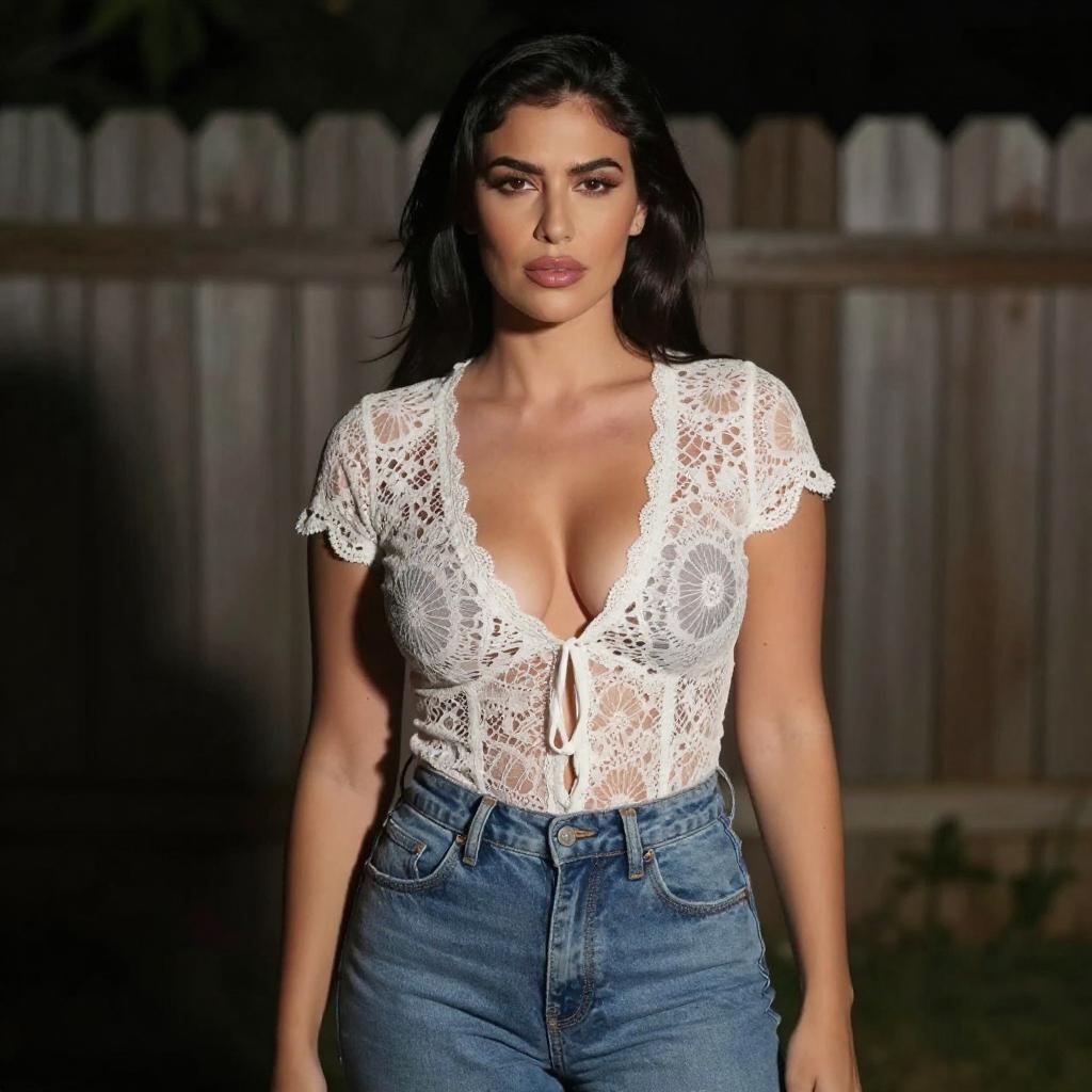 Photograph of a dark-haired woman with tan skin, wearing a deep V-neck white lace top and high-waisted blue jeans, standing in front