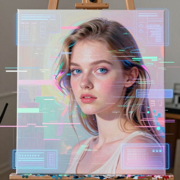 Digital portrait of a young woman with blue eyes and wavy brown hair, illuminated by neon lines and text overlays, displayed on an artist's easel