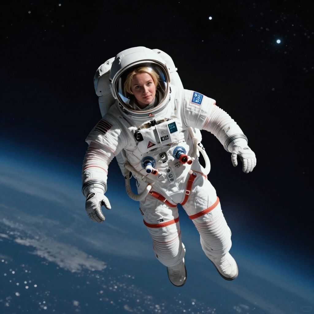 Photorealistic image of a blonde astronaut floating in space, wearing a white spacesuit with red straps, against a dark, starry background and the