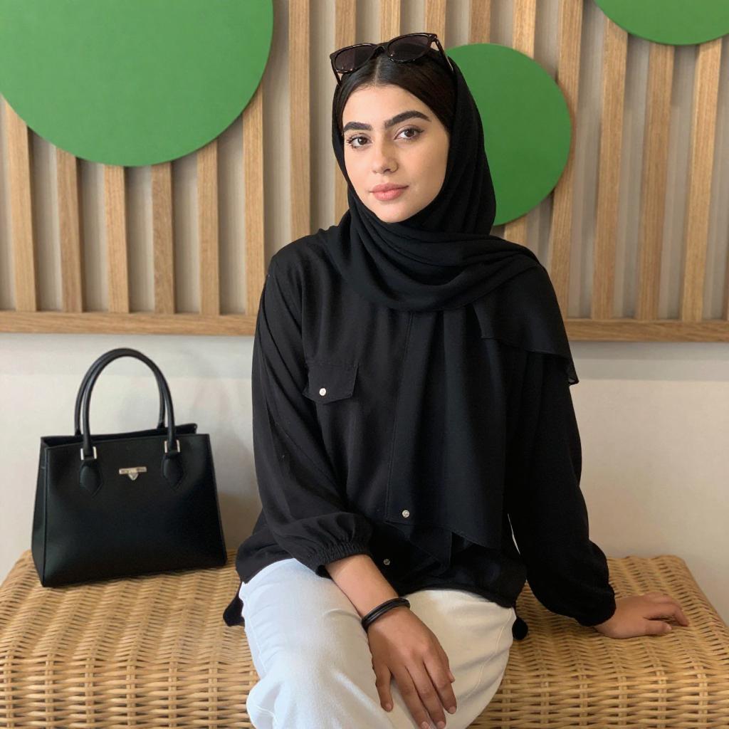 Photograph of a young woman with fair skin and dark hair, wearing a black hijab, black blouse, and white pants, sitting on a wicker bench. She has sunglasses on her head and a black handbag hangs on the wall behind her. The background includes vertical wooden slats and green circular wall decorations.