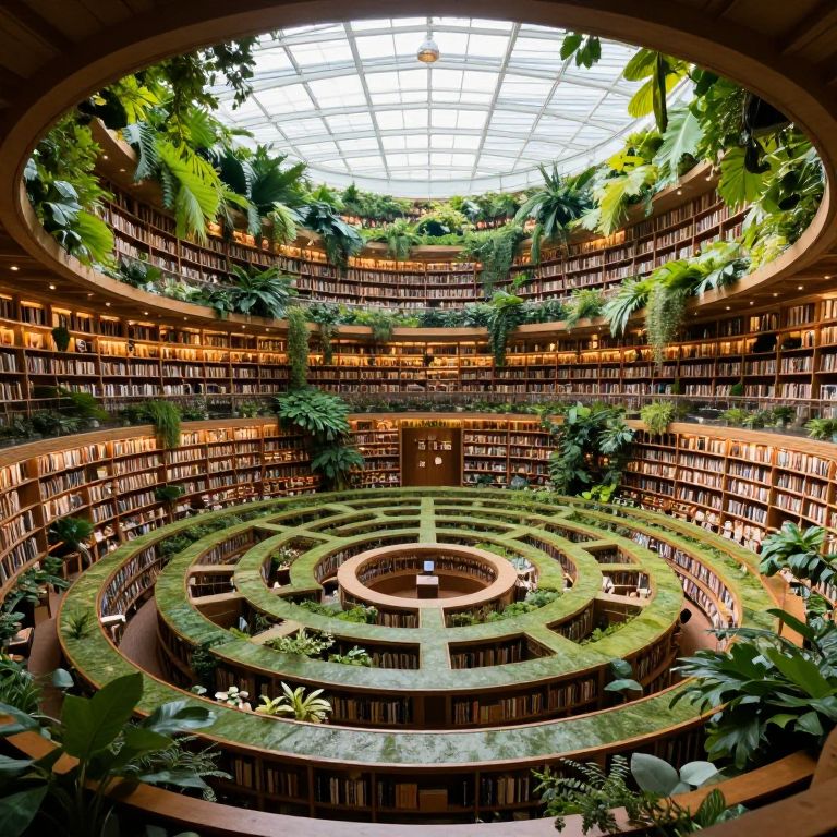 Photograph of a circular, multi-story library with lush green plants, bookshelves, and a central, intricate green maze-like floor design under a