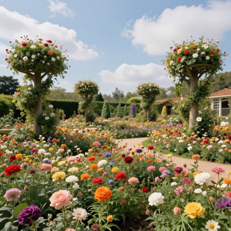 Photograph of a vibrant, sunlit garden. The foreground is filled with a colorful array of blooming flowers, including red, yellow, pink, and white dahlias, and orange and purple pansies. Two tall, leafy trees topped with cascading garlands of mixed flowers stand on either side of a winding, gravel path that leads to a house with a red-tiled roof in the background. The sky above is bright blue with scattered white clouds, and the garden is surrounded by lush green hedges. The scene is rich in texture and color, evoking a sense of peaceful, natural beauty.