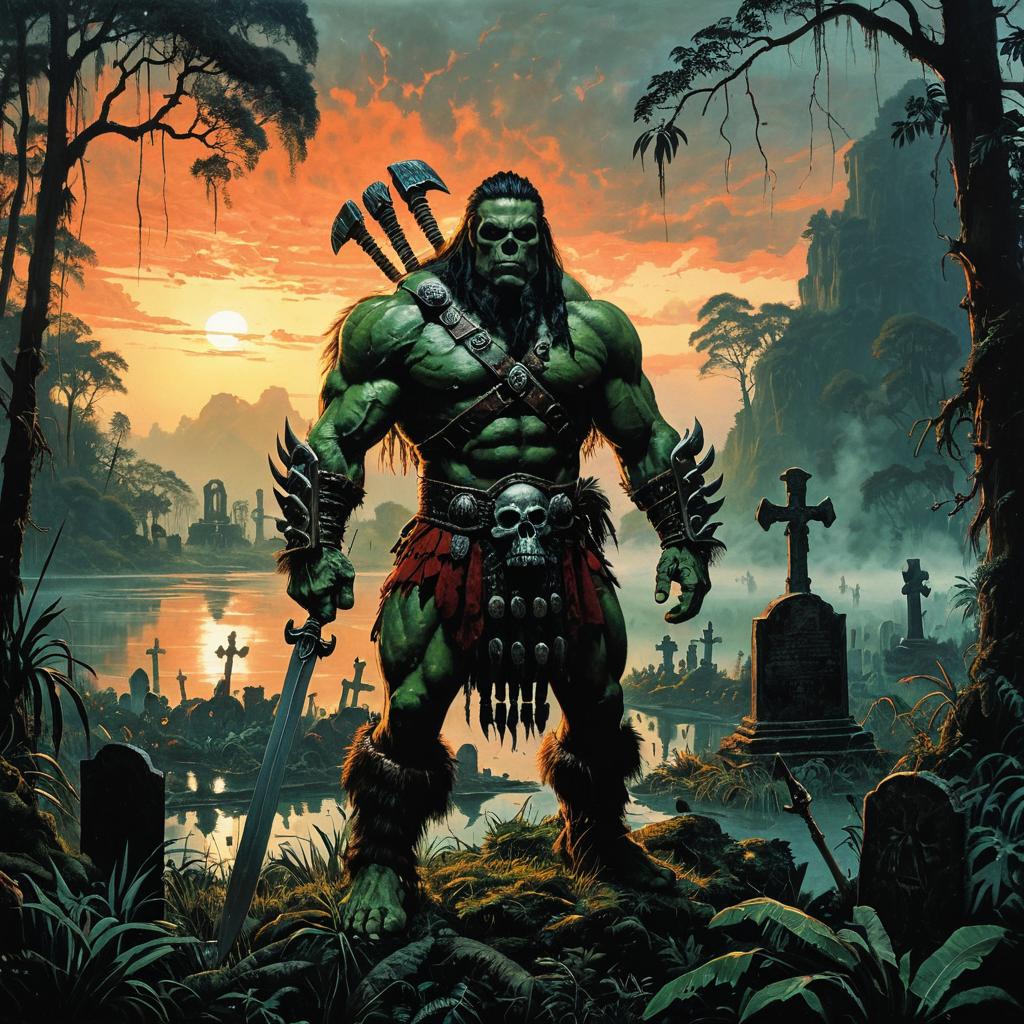 A hulking barbarian chieftain, standing in a foggy backlit jungle filled with corpses, with a lake and backlit graveyards, muscular oversized skeleton silhouette, green atmosphere, highly detailed oil painting by John Blanche with visible brushmarks, dramatic clouds, sunset red panorama