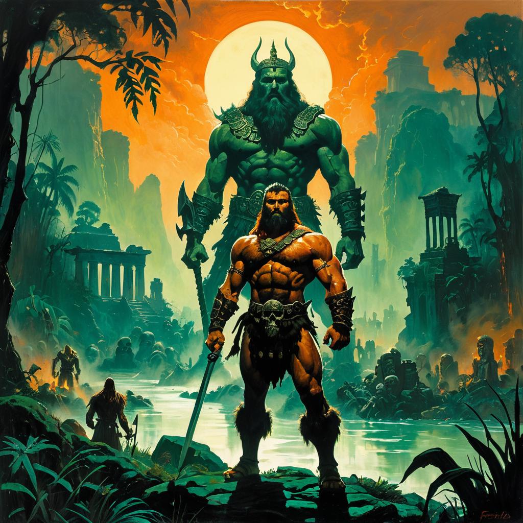 Hulking Barbarian Chieftain in Foggy Jungle
