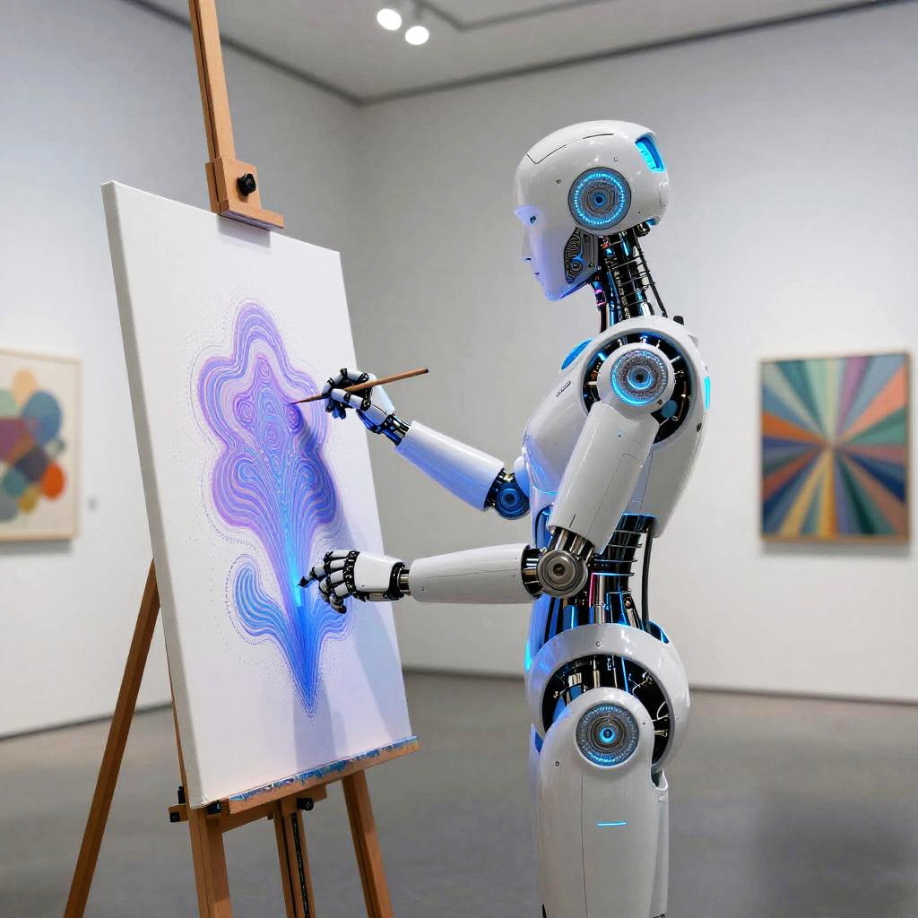 Futuristic AI Artist in Minimalist Gallery