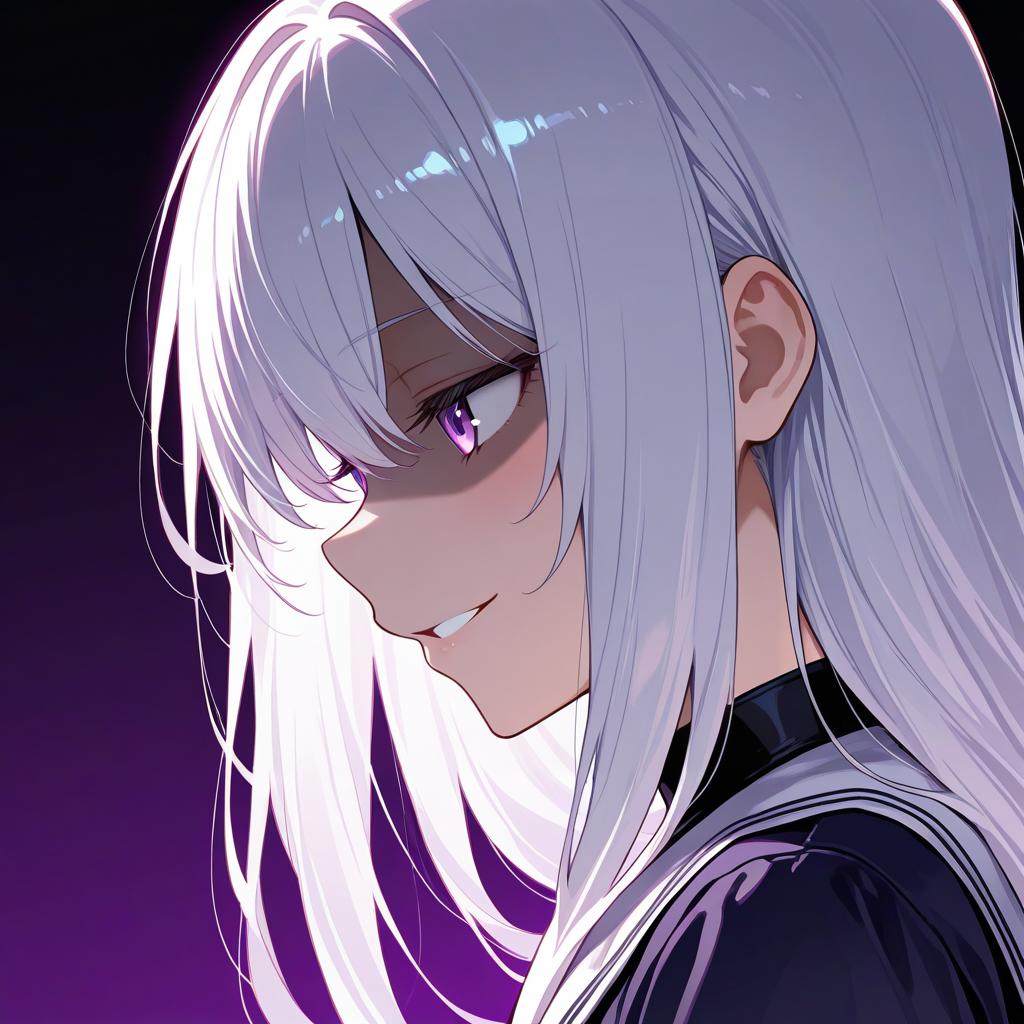 Side profile of an anime girl with long white hair and glowing purple eyes. She has a shaded face with a subtle evil smile, wearing a dark outfit with a high collar and light accents, against a dark purple background.