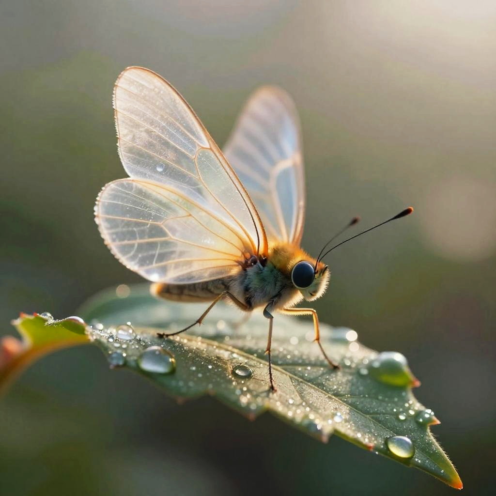 Close-up of a single pix with translucent wings perched on a dew-covered leaf, morning light casting a warm glow, hyper-realistic textures of the pix's delicate features and the leaf veins, fantasy realism style with a dreamy atmosphere.