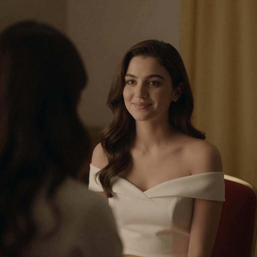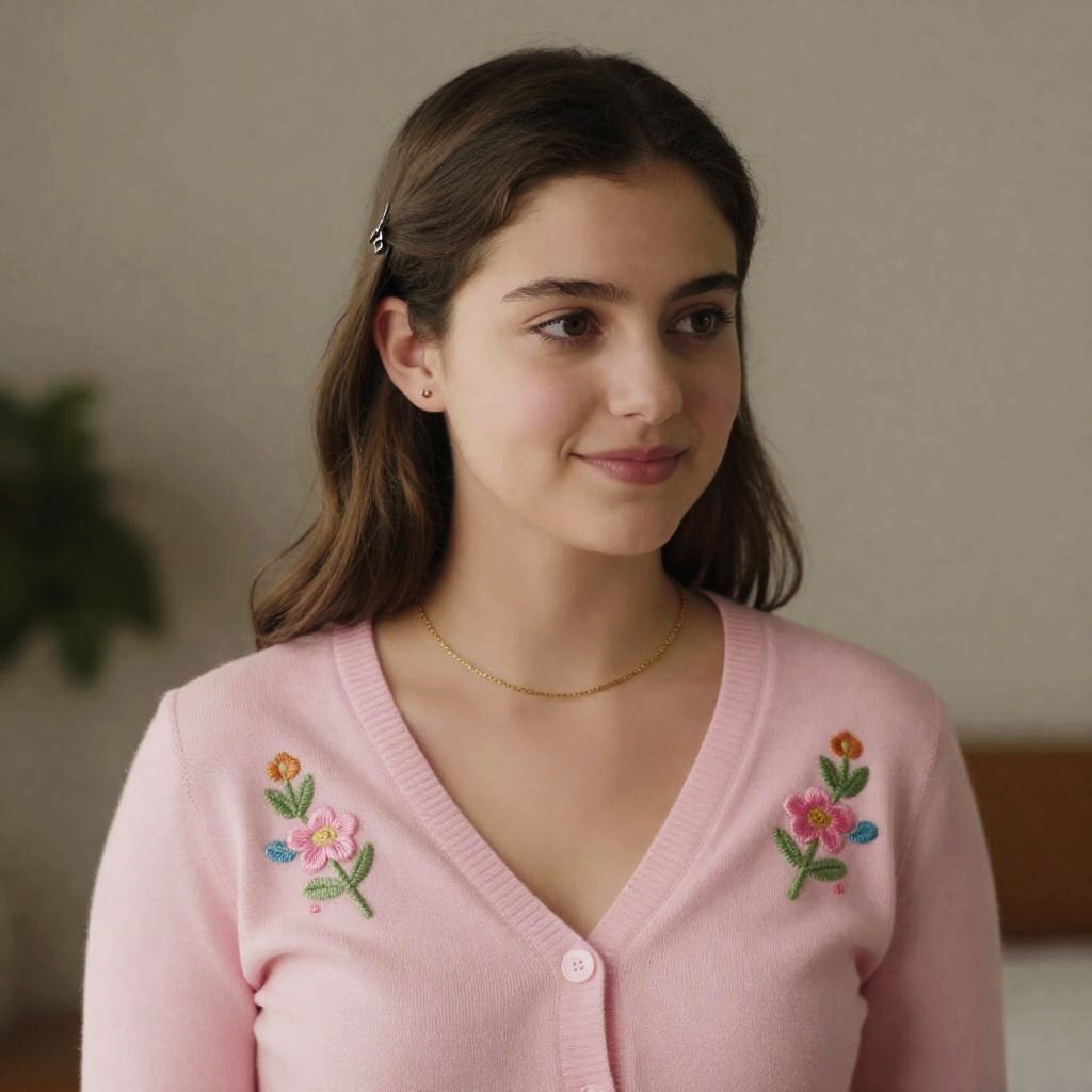 Photograph of a young woman with light skin and brown hair in a side part, wearing a pink cardigan with floral embroidery, and a thin gold chain necklace. She has a slight smile and looks to the right. Background is blurred. Hair clip in her left hair. Medium close-up.