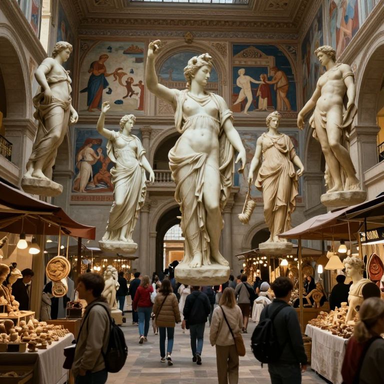 This photograph depicts a bustling indoor market with classical Greek and Roman-style marble statues prominently displayed in the center. The statues, featuring muscular male and female figures in various poses, are illuminated by warm, overhead lights. Surrounding the statues, several market stalls with red and beige awnings sell various artisanal goods, including pottery and jewelry. The background showcases elaborate, colorful frescoes depicting historical scenes on the high walls. Shoppers, dressed in casual attire, walk through the market, creating a lively atmosphere. The floor is checkered with dark and light tiles, adding to the market's charm.
