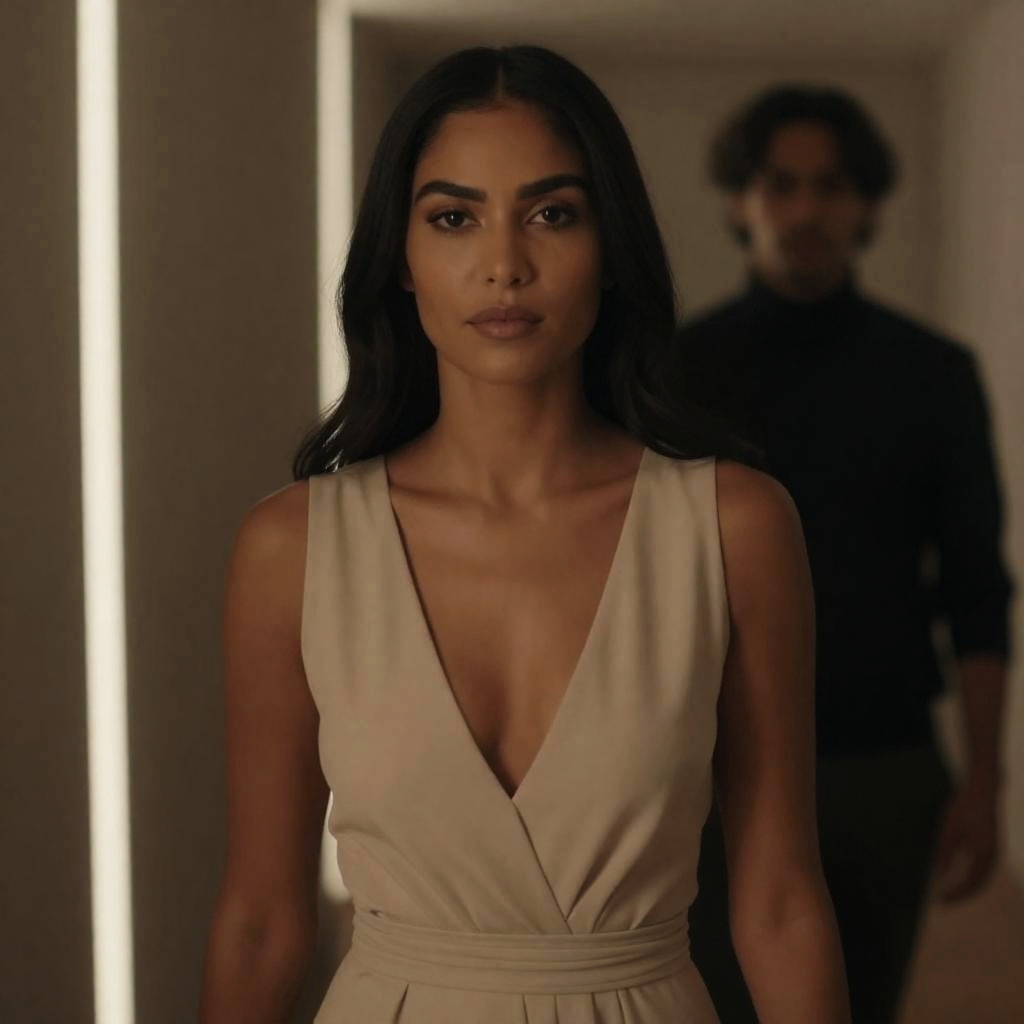 Photograph of two people on a sandy beach with palm trees. A woman with dark hair, wearing a beige bikini with floral accents, holds two wooden bowls in both hands. She stands facing a man with curly blond hair, wearing a pink shirt, who is looking at her. Palm trees are in the background. The woman has a serious expression, and the man's expression is not visible. The woman is centered, and the man is partially turned away to the right.