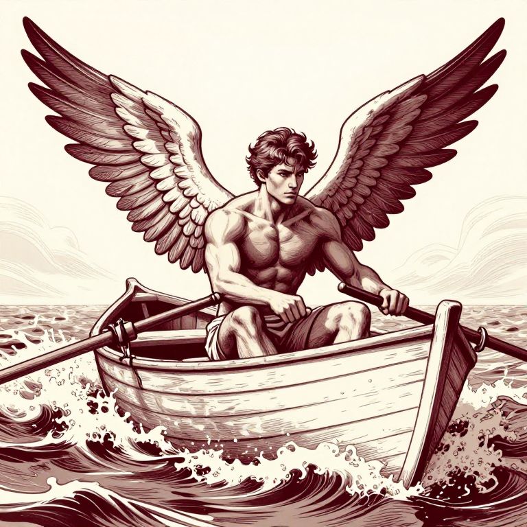 Bold Lines a muscular, young, male angel angel sitting in a wooden rowing boat on a wild sea with big waves, zoomed out, burgundy and off-white, cinematic, detailed drawing, poster style,