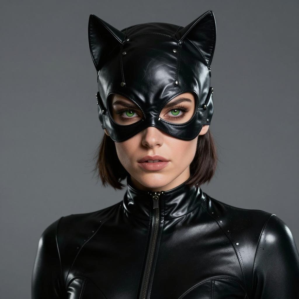 Male catwoman cosplay, photorealistic, female, catwoman cosplay, dark brown hair, short hair, black leather mask with cat ears, intense green eyes, full lips, black leather bodysuit, high collar, shiny ure, close-up, neutral gray background, dramatic lighting, serious expression, comic book style, detailed ures, studio portrait, realistic, digital art, high contrast