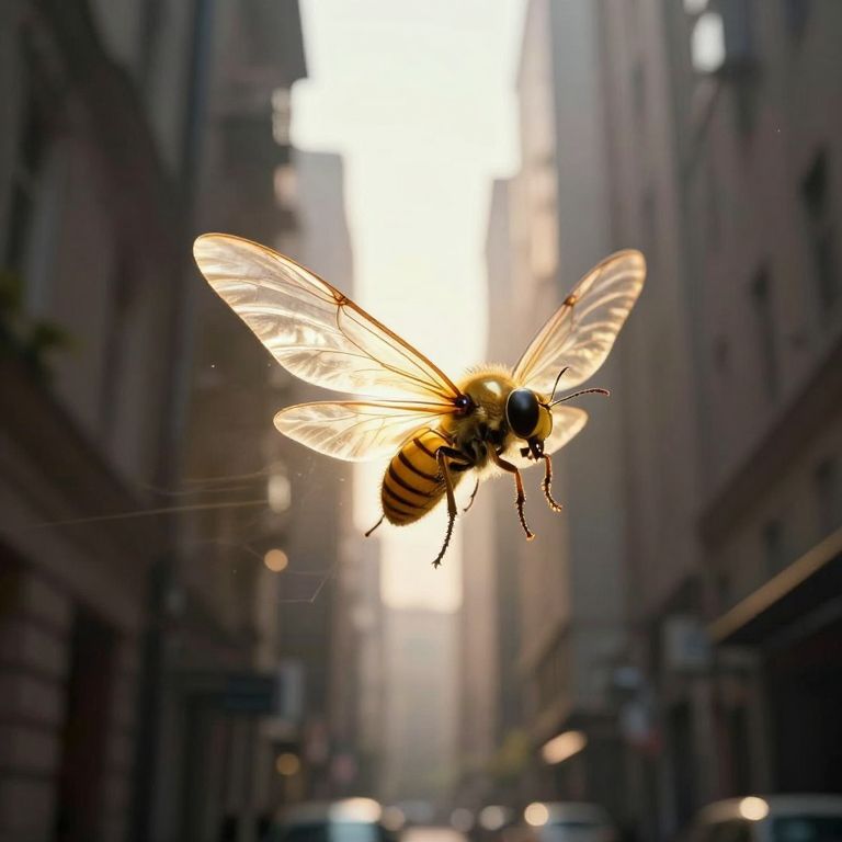A golden insect with translucent wings bathed in sunlight floats serenely across a narrow urban canyon, defying gravity as it weaves an ethereal path between towering buildings at dawn.