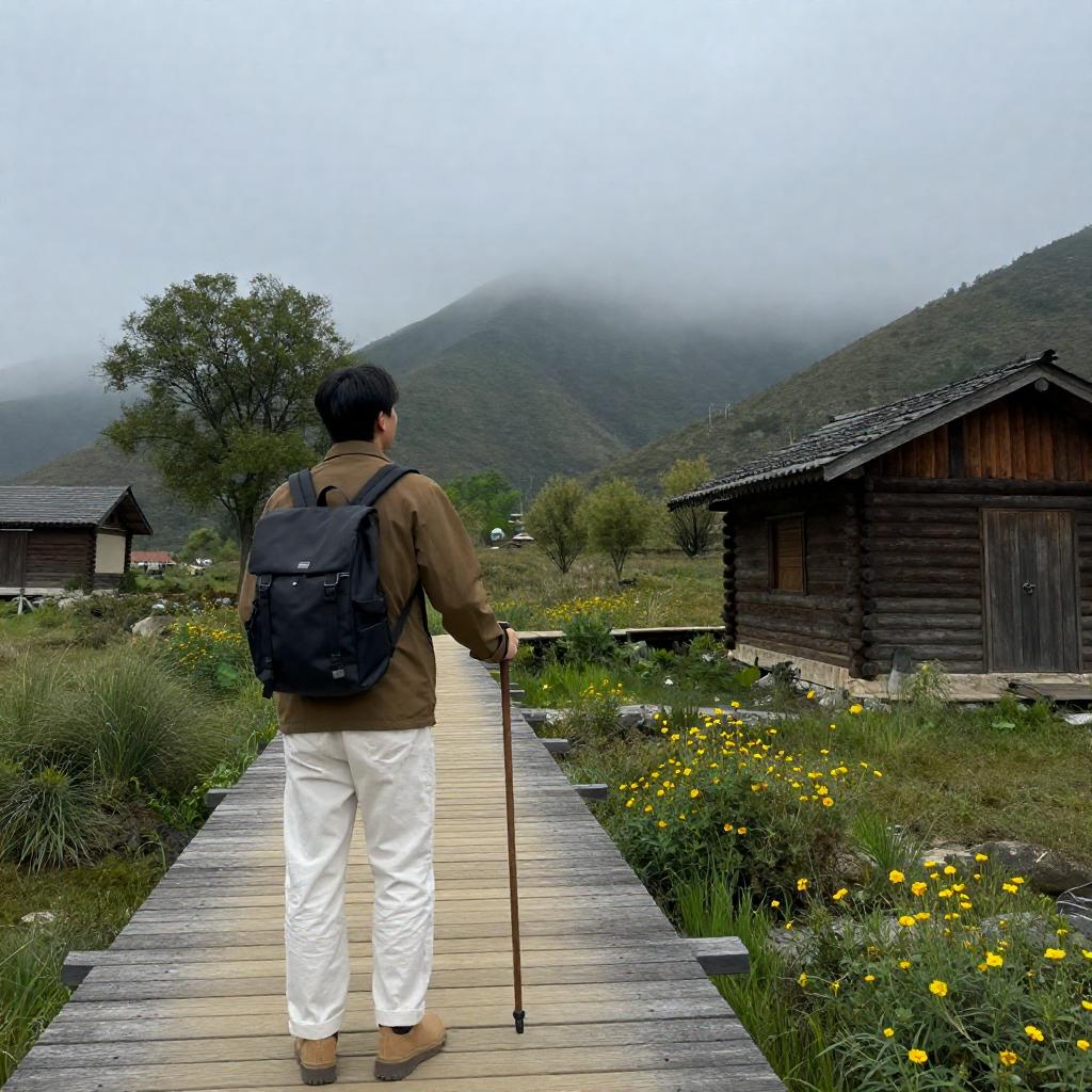 Man with backpack, wearing brown jacket and white pants, standing on wooden bridge, holding walking stick, looking right. Mountainous landscape with foggy background, wooden hut on right, lush greenery, yellow flowers, and trees. Overcast sky.