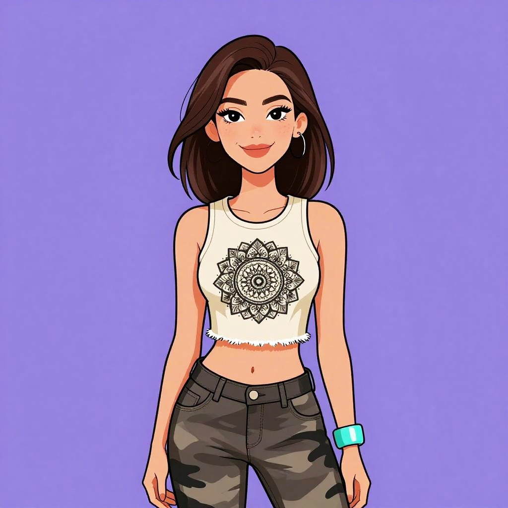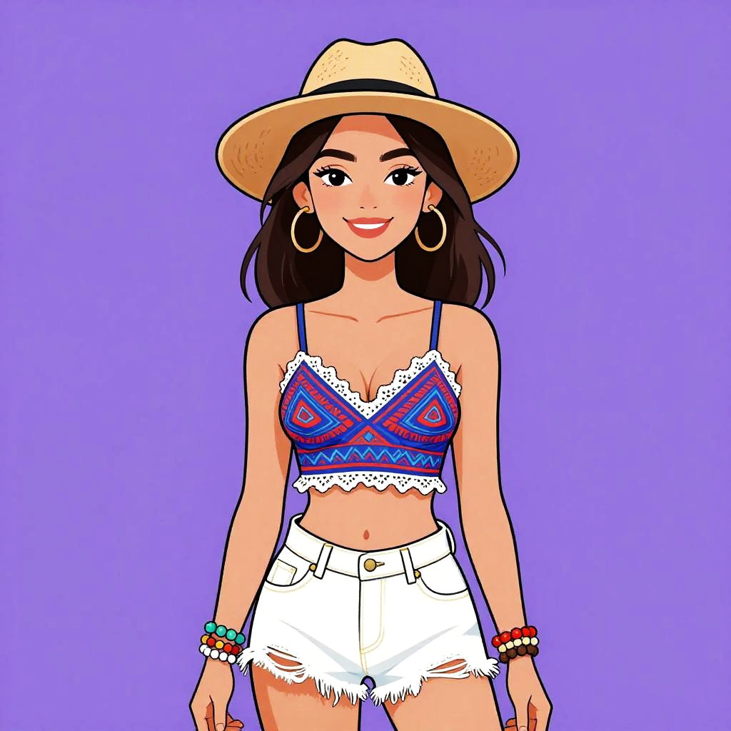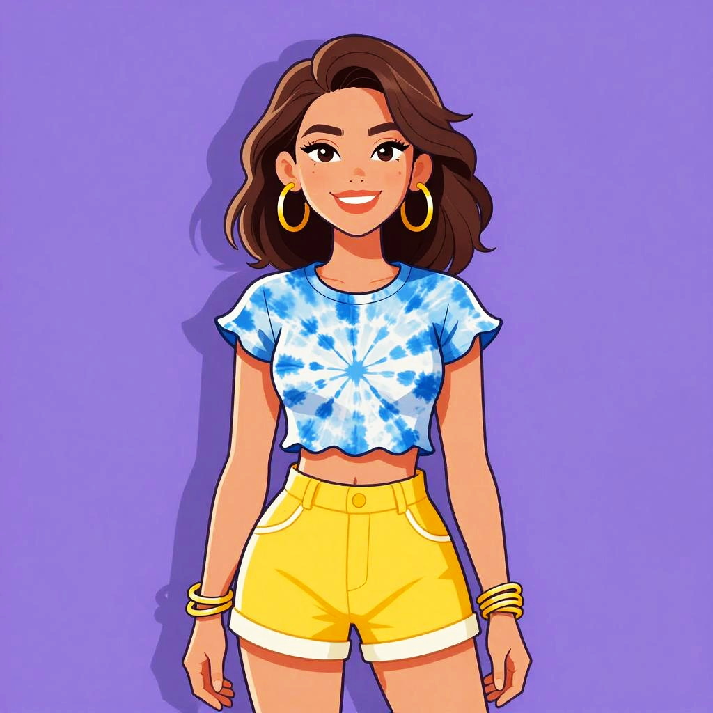 Woman with pretty face and pretty hair. smiling Woman, summer clothing, cropped blue tie-dye t-shirt with flutter sleeves and scalloped hem, high-waisted yellow shorts with white piping detail, multiple gold bangle bracelets. --sref 1467
