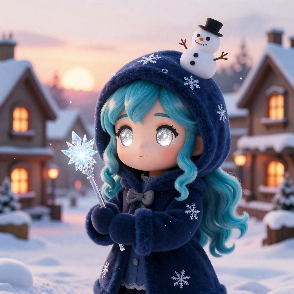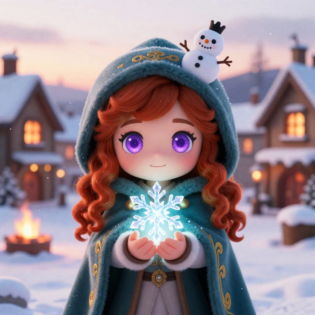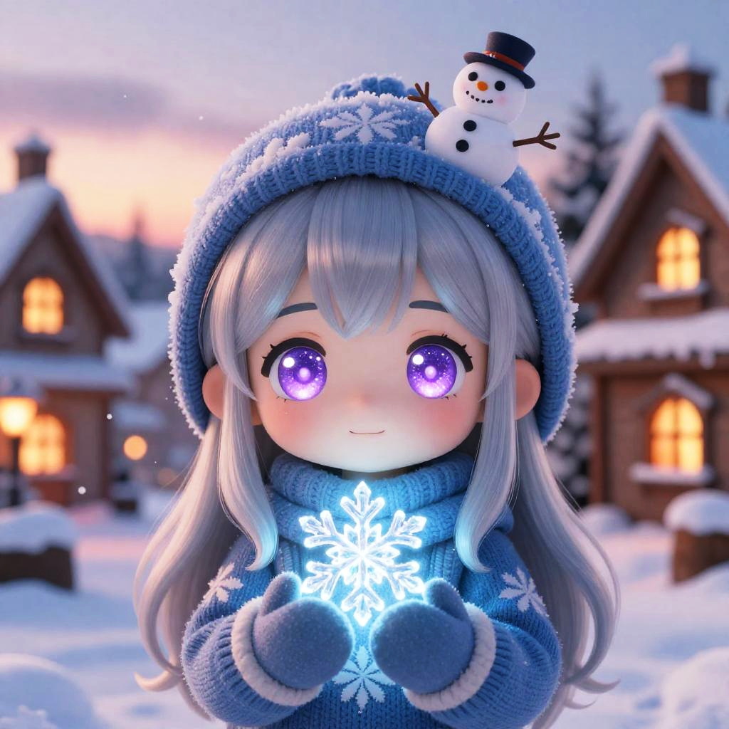A chibi character with sparkling violet eyes and long silver hair with side bangs, wearing a soft knitted blue sweater with snowflake patterns and woolen mittens, holding a glowing crystal snowflake in their hands. A tiny snowman sits on the hood, surrounded by a snowy village at sunset with warm lights glowing from windows. Soft snowflakes fall gently in this detailed digital art scene. A warm and cozy festive winter setting with cinematic lighting, glowing fire and sunset hues, highly detailed and adorable character, in a fantasy winter environment.