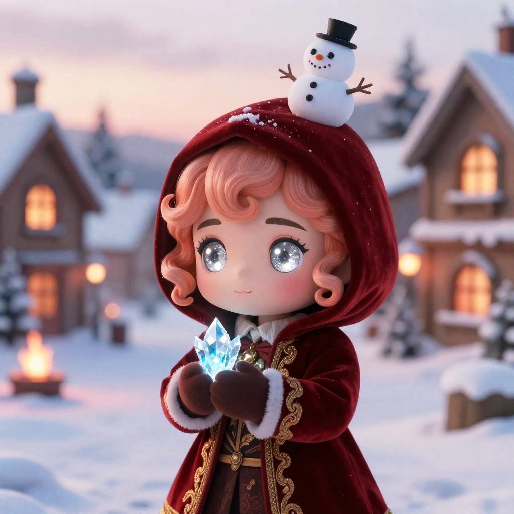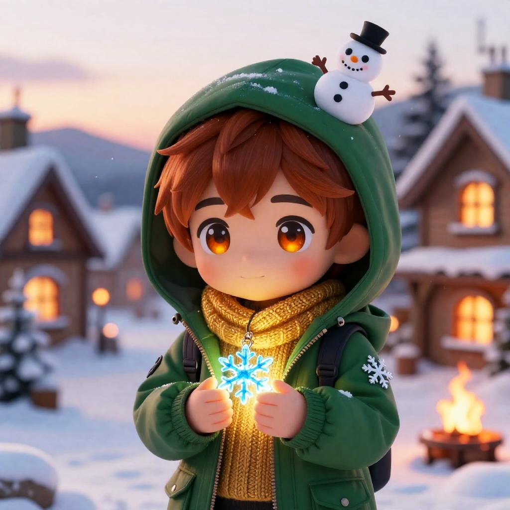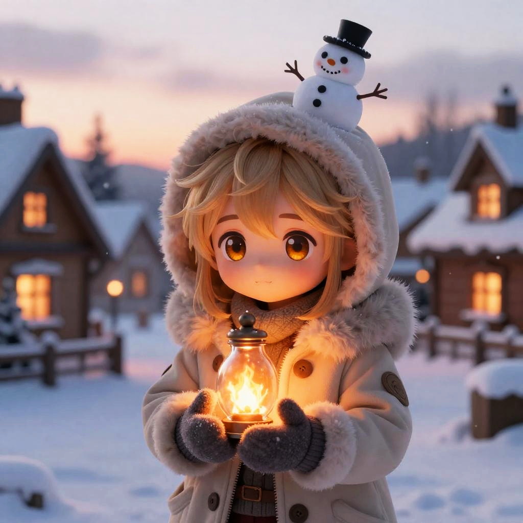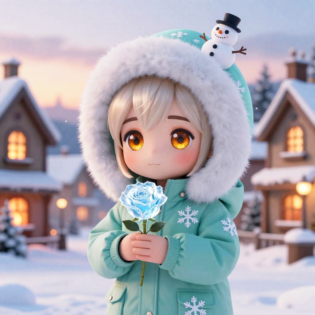 A chibi character with sparkling violet eyes and long silver hair with side bangs, wearing a soft knitted blue sweater with snowflake patterns and woolen mittens, holding a glowing crystal snowflake in their hands. A tiny snowman sits on the hood, surrounded by a snowy village at sunset with warm lights glowing from windows. Soft snowflakes fall gently in this detailed digital art scene. A warm and cozy festive winter setting with cinematic lighting, glowing fire and sunset hues, highly detailed and adorable character, in a fantasy winter environment.