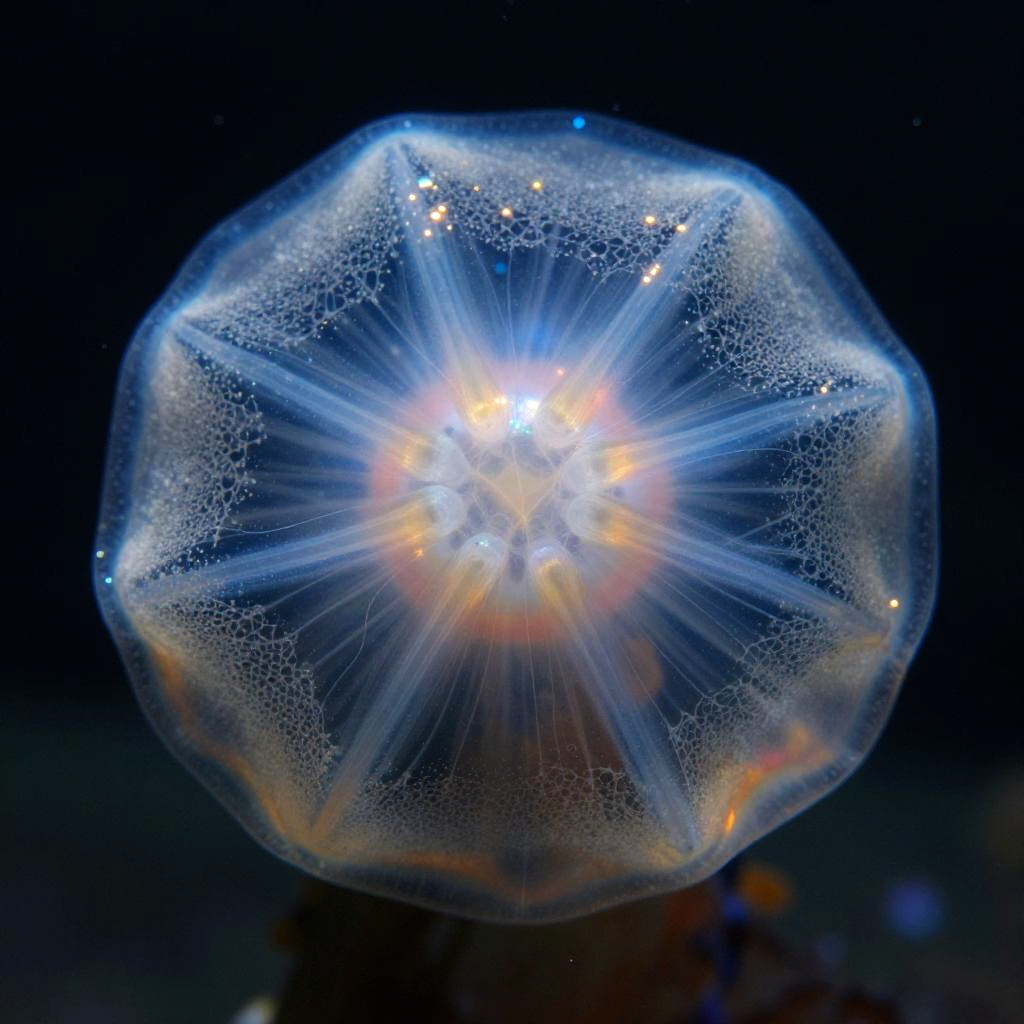 Close-up of a jellyish sea creature with intricate textures, semi-transparent body shimmering with iridescent hues, surrounded by tiny glowing particles in deep ocean darkness