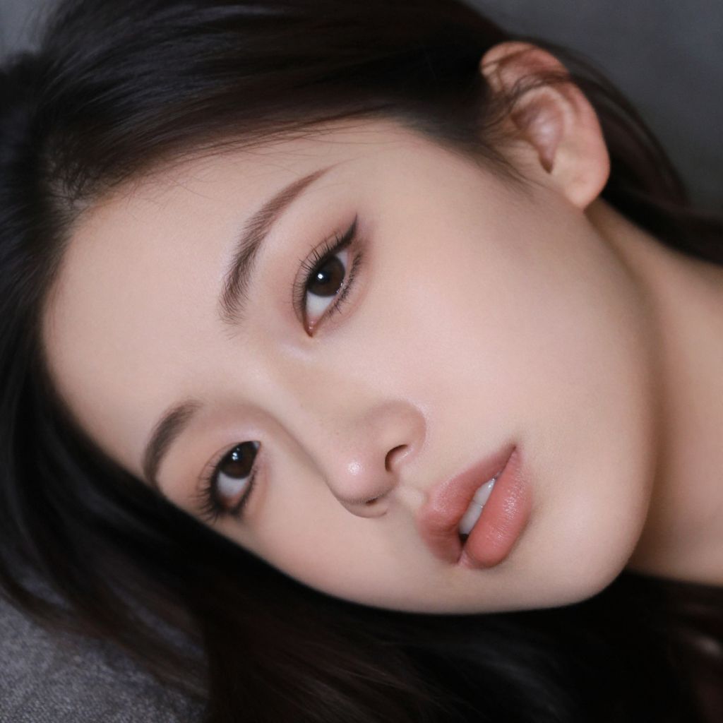This is a close-up, slightly blurry photograph of a young woman with dark hair and fair skin, lying down with her head tilted to the side. Her dark, smoky eye makeup contrasts with her soft, glowing skin. The background is dark and out of focus, making her face the main focus. The lighting creates a gentle, intimate atmosphere.