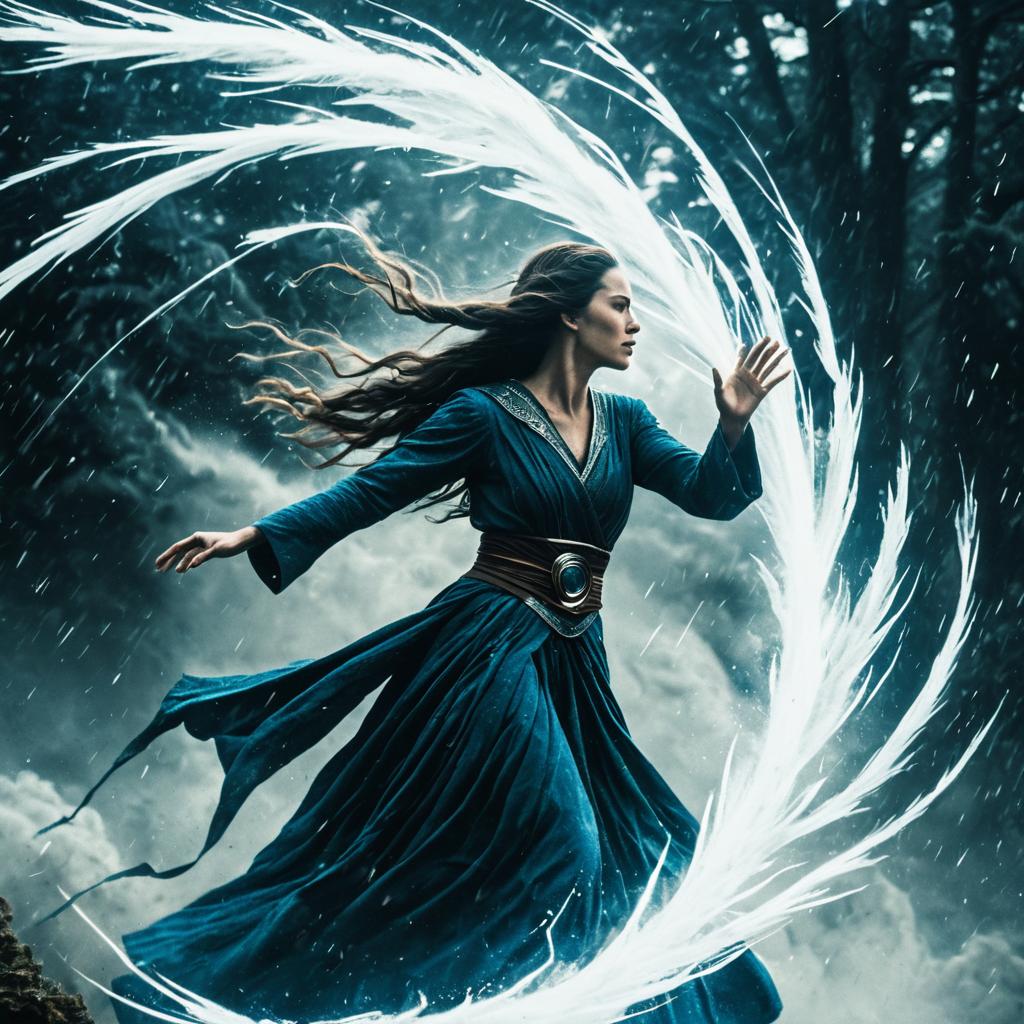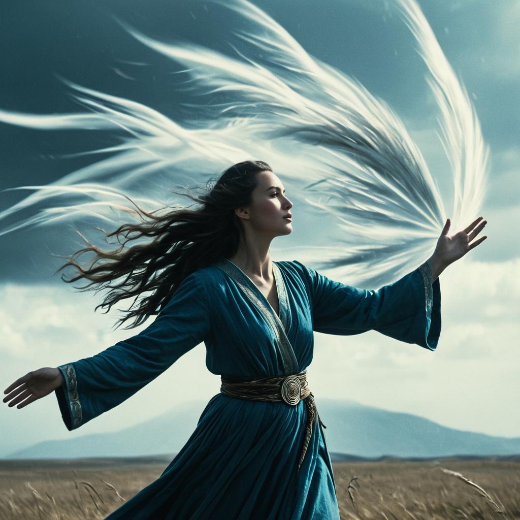 A woman dressed in a flowing teal medieval-style robe with intricate designs on the sleeves and a decorative belt stands in a field with mountains in the background. Her dark hair flows in the wind as she extends one arm, releasing ethereal, white, wispy wind magic that swirls around her, evoking the presence of a powerful wind spirit.