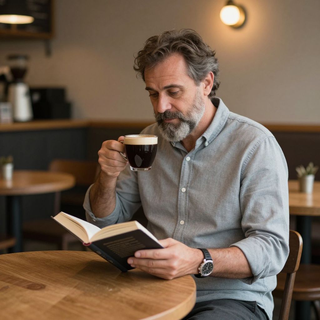 A quiet coffee shop interior with warm lighting and wooden tables, a middle-aged man with kind eyes and a slightly tousled grey beard sitting alone at a corner table, reading a book while sipping black coffee, wearing a soft grey button-down shirt that gently fits over his broad shoulders.