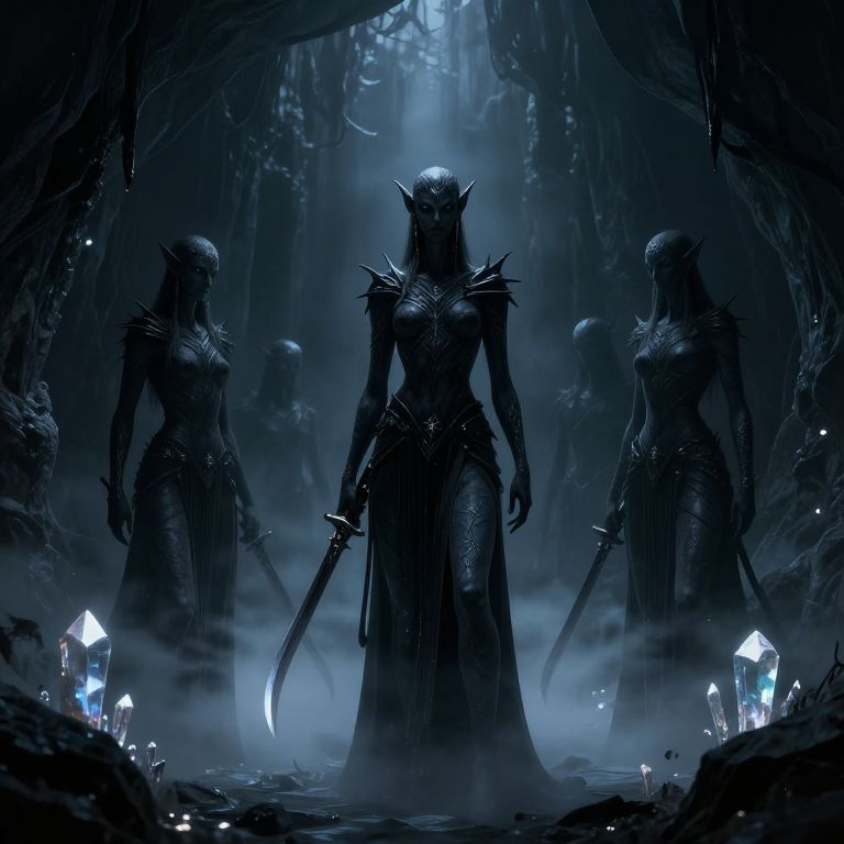 Svartálfar warriors emerging from shadowy caves, tall slender black elves with elongated ears and mystical tattoos, wielding curved dark blades, surrounded by glowing crystals and fog, a mysterious and magical atmosphere, highly detailed fantasy illustration