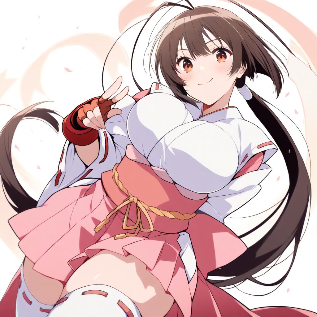 Musubi, sekirei, 1girl, brown eyes, brown hair, long hair, ahoge, ponytail, large breasts, fingerless gloves, thighhighs, by artist u35, animagine