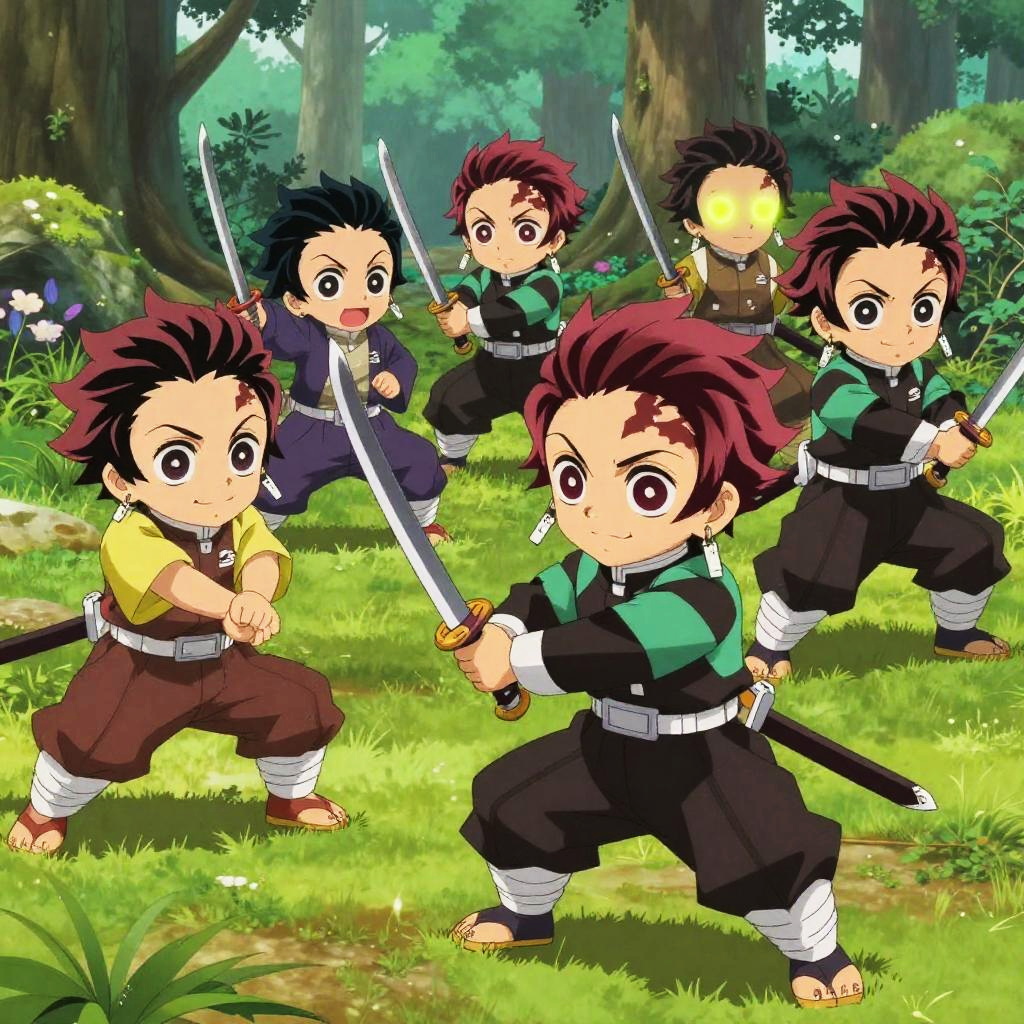 Fantasy scene featuring baby demon slayer characters training with small katanas, detailed anime style, glowing demon eyes in the background, lively forest environment, bright and energetic