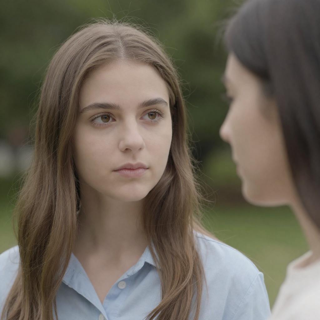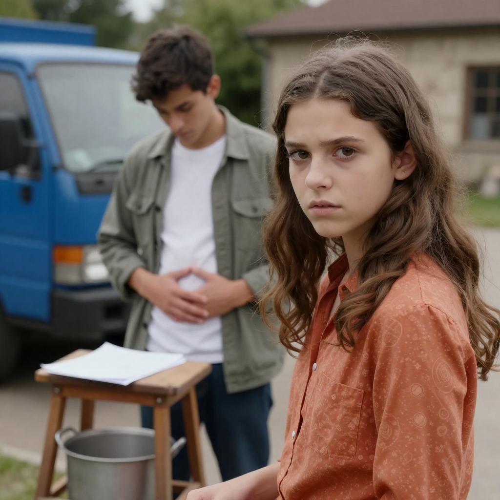 Photograph of two young people outdoors. Foreground: brown-haired girl with wavy hair, intense expression, wearing orange patterned shirt. Background: boy with dark hair, green jacket, white shirt, standing, looking down at papers on wooden stool. Blue truck, stone building, greenery in background. Boy's hands on stomach. Metal pot on ground in front.