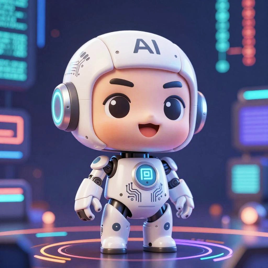 Chibi AI art portraying a tiny machine learning avatar with a cheerful expression, blending elements of cute anime style and advanced technology, featuring circuit-like tattoos and a backdrop of swirling colorful AI code patterns.