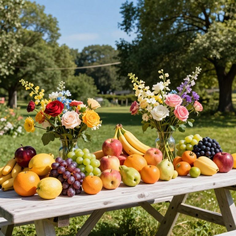 A collection of Bowles filled with fresh fruits and flowers on a festive outdoor picnic table, bright colors and lively composition, summer day with blue sky and lush greenery background, vibrant and inviting.