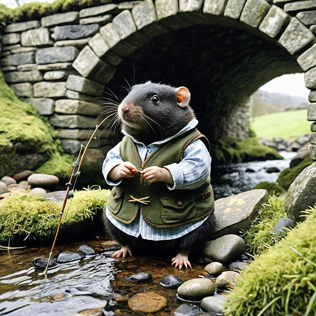 A whimsical storybook scene inspired by Beatrix Potter, featuring a curious mouse in soft pastel hues with a blurred background, interacting with a miniature teapot amidst a bed of fresh herbs,