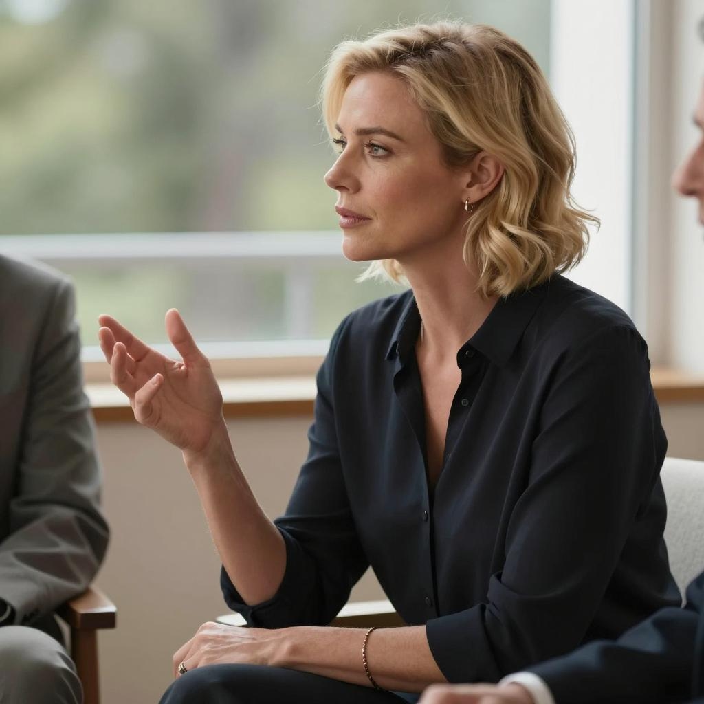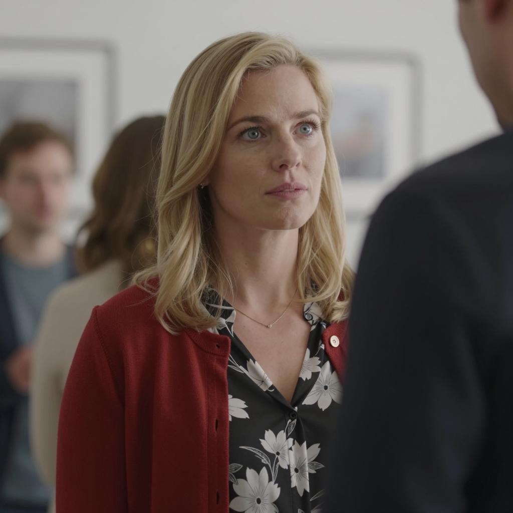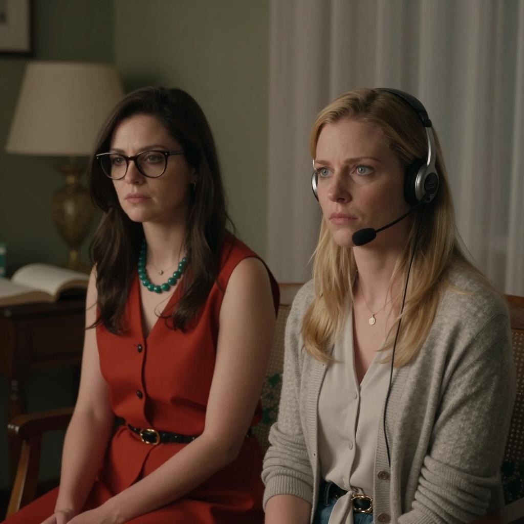 Blonde woman with blue eyes, wearing a red cardigan, holding a headset to her ear, looking forward. Background includes an older man with a mustache in a suit, and a partially visible woman with brown hair. Indoor setting with screens. She has fair skin, and the man has a light brown complexion. She has light makeup. The man in the background is slightly out of focus. Three people in total.