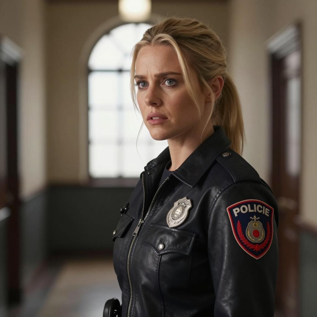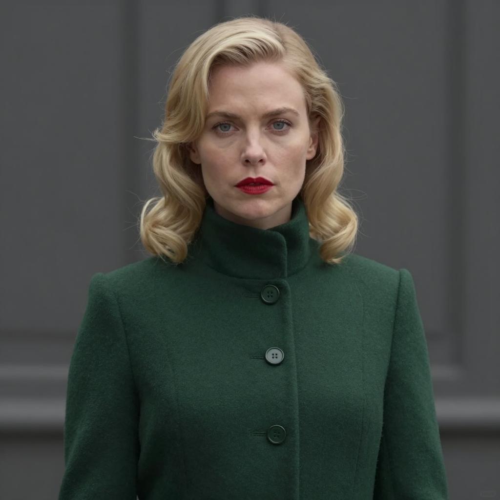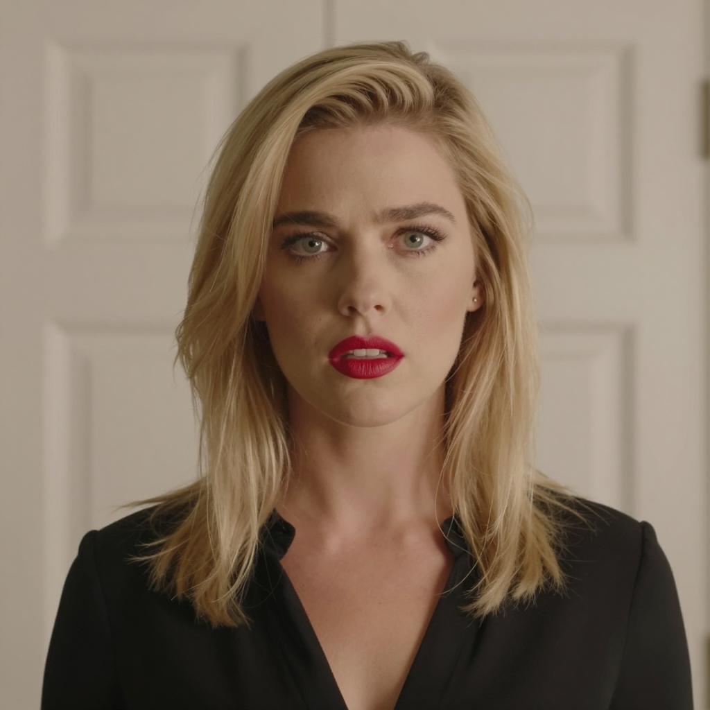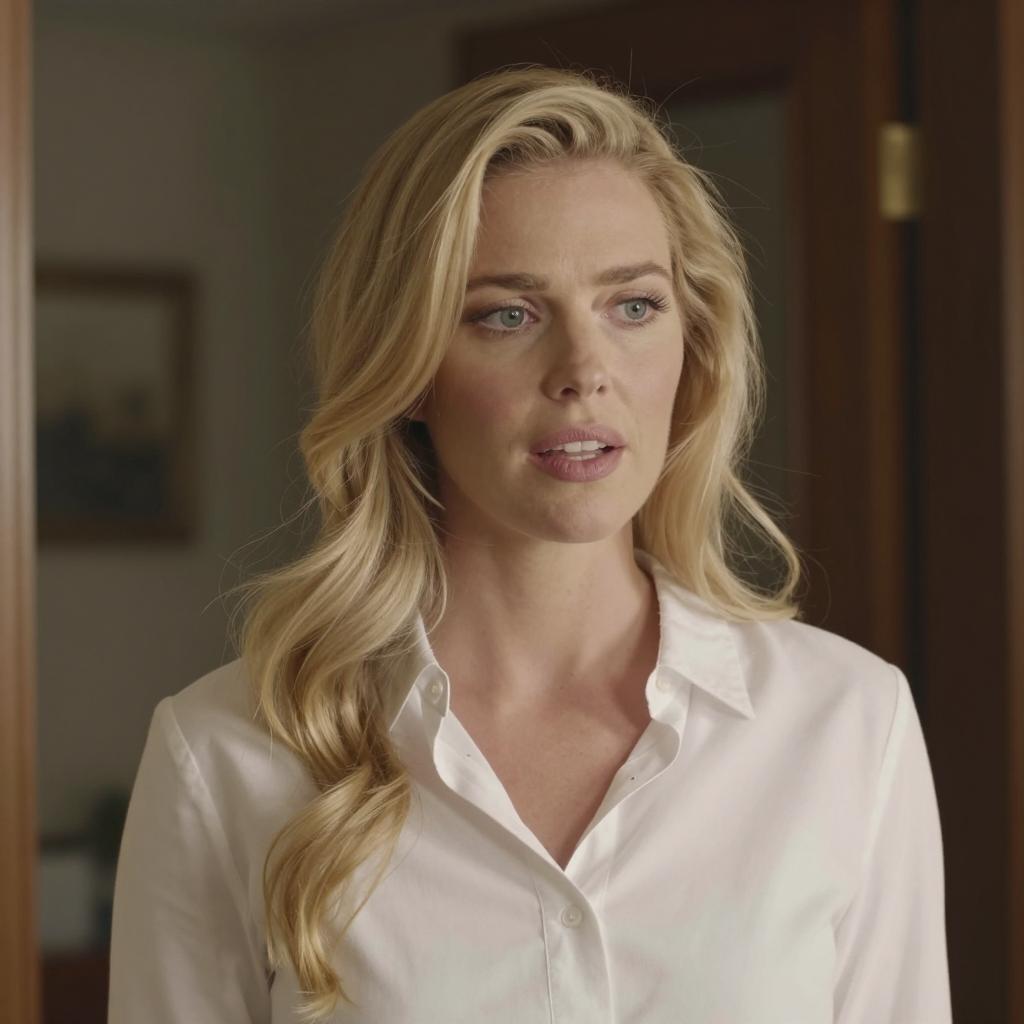 Blonde woman with blue eyes, wearing a red cardigan, holding a headset to her ear, looking forward. Background includes an older man with a mustache in a suit, and a partially visible woman with brown hair. Indoor setting with screens. She has fair skin, and the man has a light brown complexion. She has light makeup. The man in the background is slightly out of focus. Three people in total.