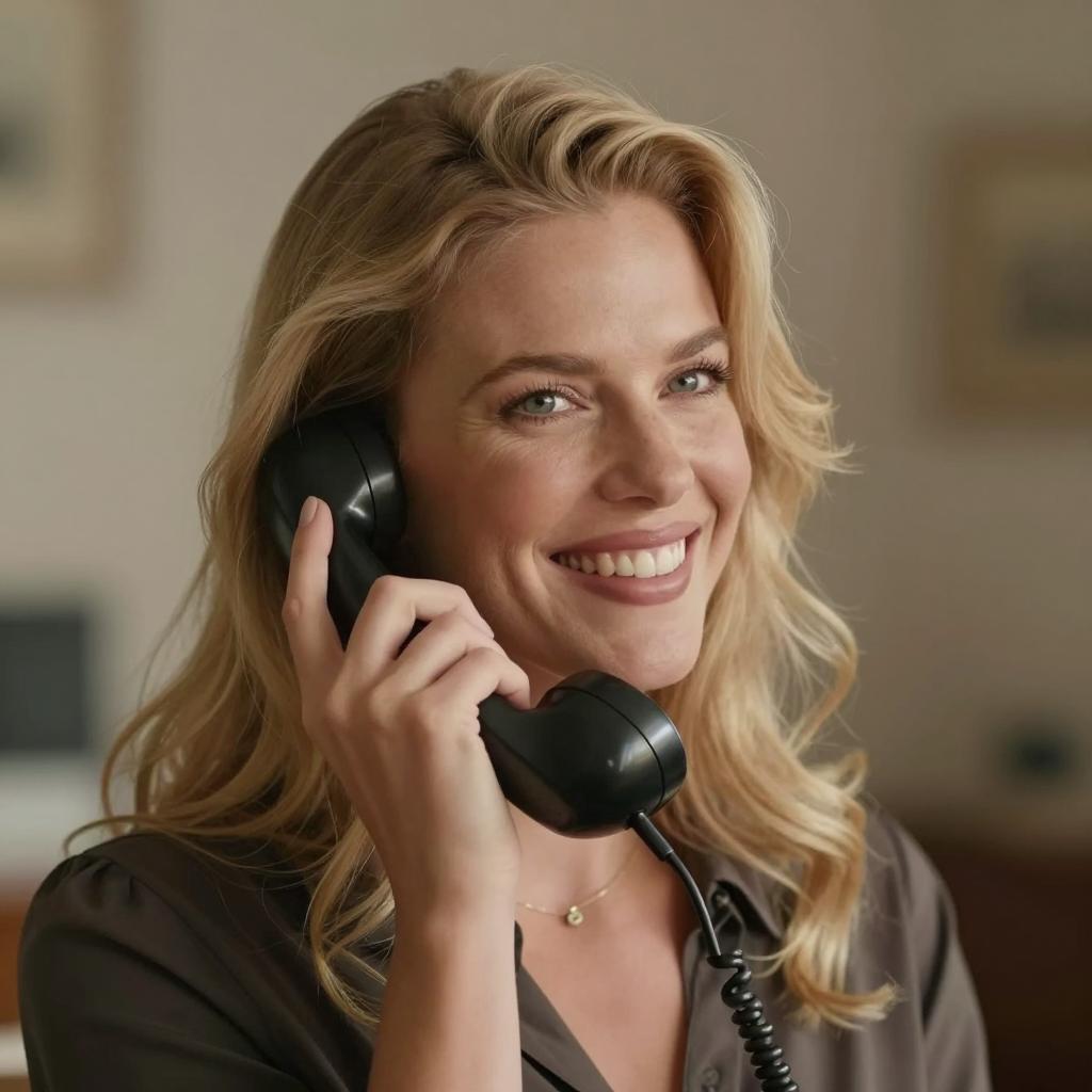 Blonde woman with blue eyes and fair skin wearing a red cardigan and holding a headset to her ear. She is indoors with two blurred colleagues in the background, one older man in a suit with a mustache and a woman with brown hair. The setting appears to be a professional environment with screens visible behind them.