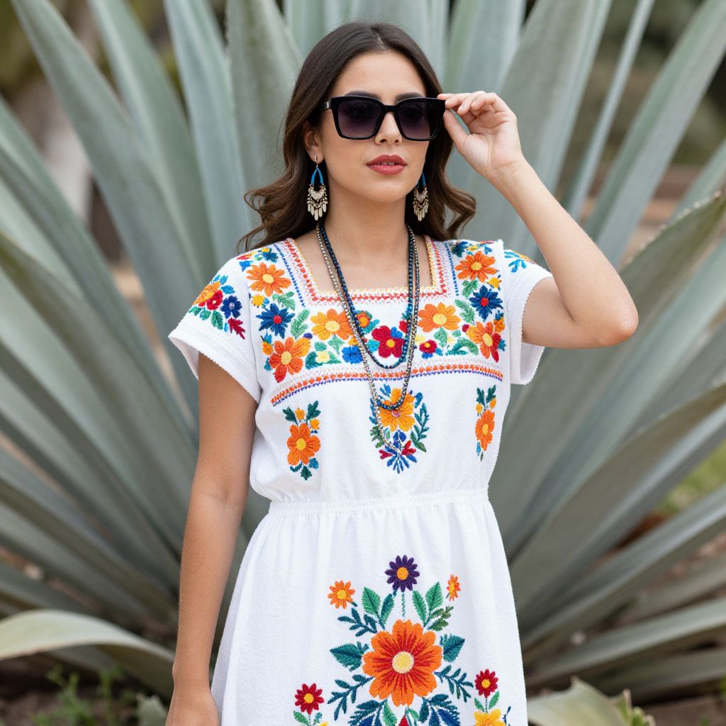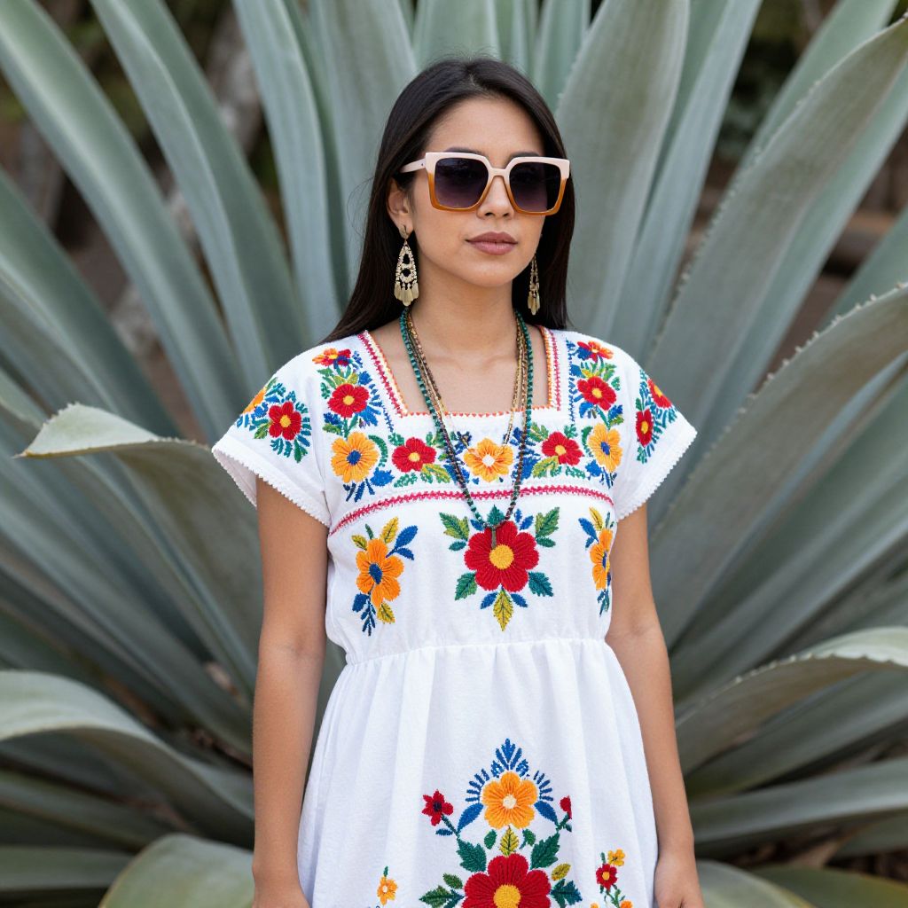 Woman wearing a vibrant Alegria white Mexican embroidered bohemian dress, adorned with colorful floral patterns and complemented by bold sunglasses, dangling earrings, and layered necklaces, stands gracefully against a backdrop of large green agave leaves.