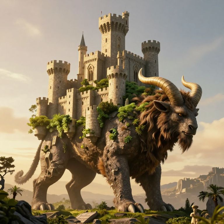 A fantastical 3D-rendered scene depicts a colossal, mythical beast with curved horns and a rugged hide, bearing the weight of an intricate medieval castle atop its back, where lush greenery intertwines with the stone structures, creating a surreal blend of nature and architecture under dramatic golden-hour lighting.