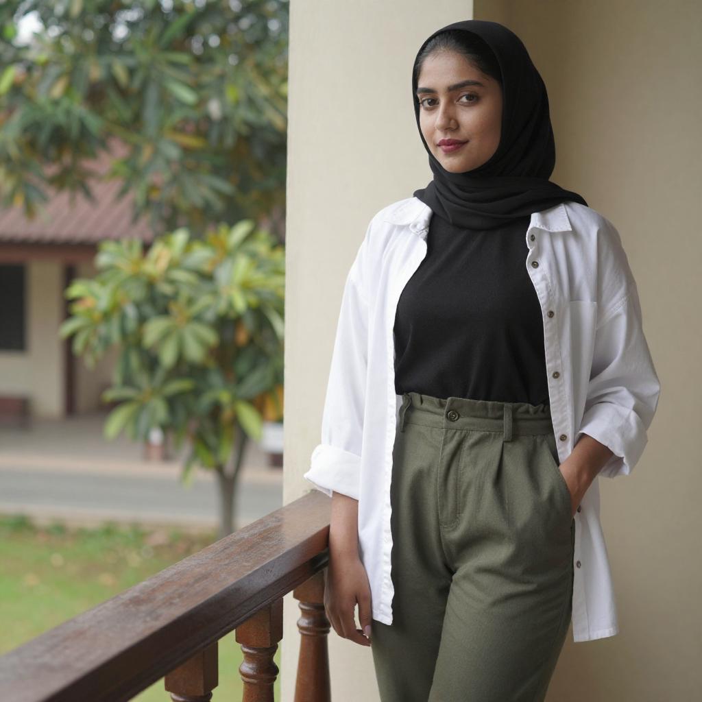 Photograph of a young woman with medium brown skin and black hijab, wearing a black turtleneck, white jacket, and high-waisted olive green pants. She stands on a wooden balcony with one hand in her pocket, leaning against a beige wall. Greenery is visible in the background.