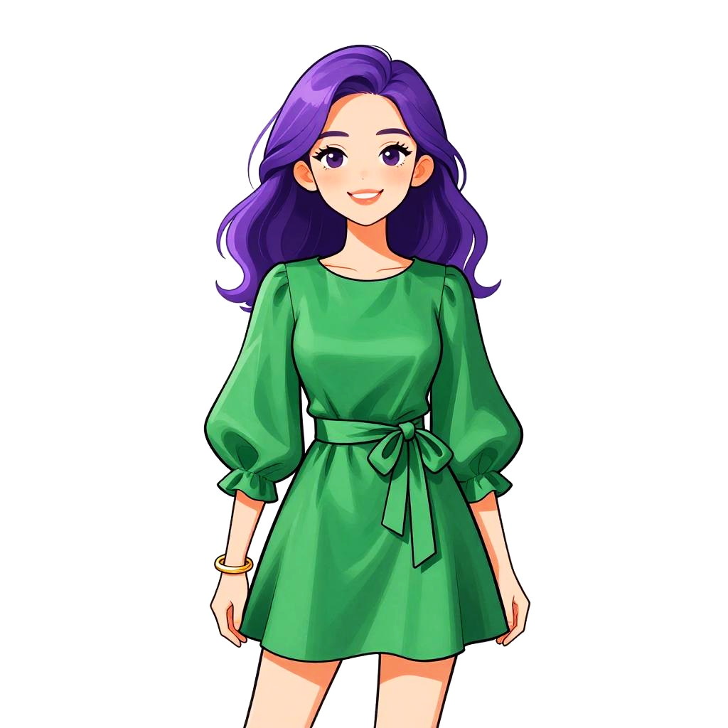 Digital anime-style drawing of a smiling young woman with purple hair, wearing a yellow short-sleeved dress, standing against a white background.