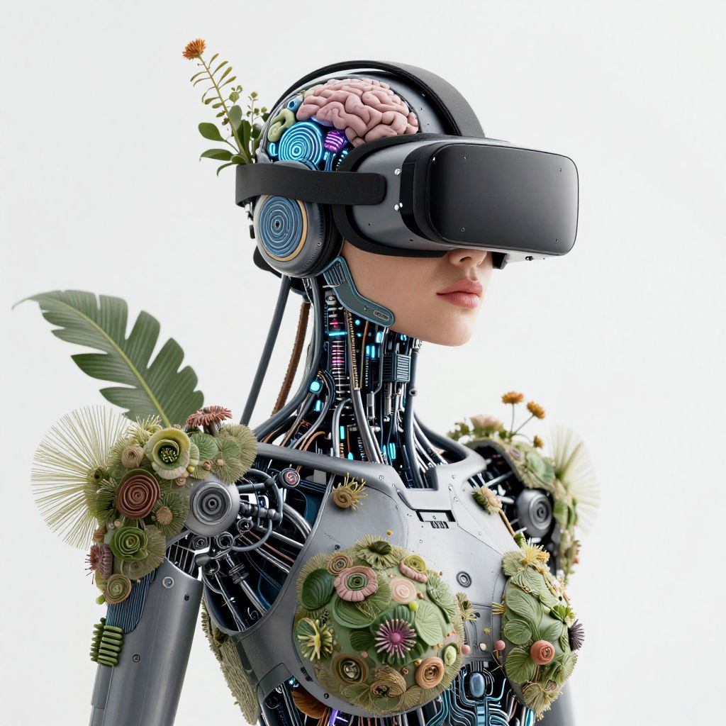 A biomechanical woman robot adorned with botanical cybernetic elements, wearing a VR helmet, surrounded by intricate detailing and electronic brain wiring.