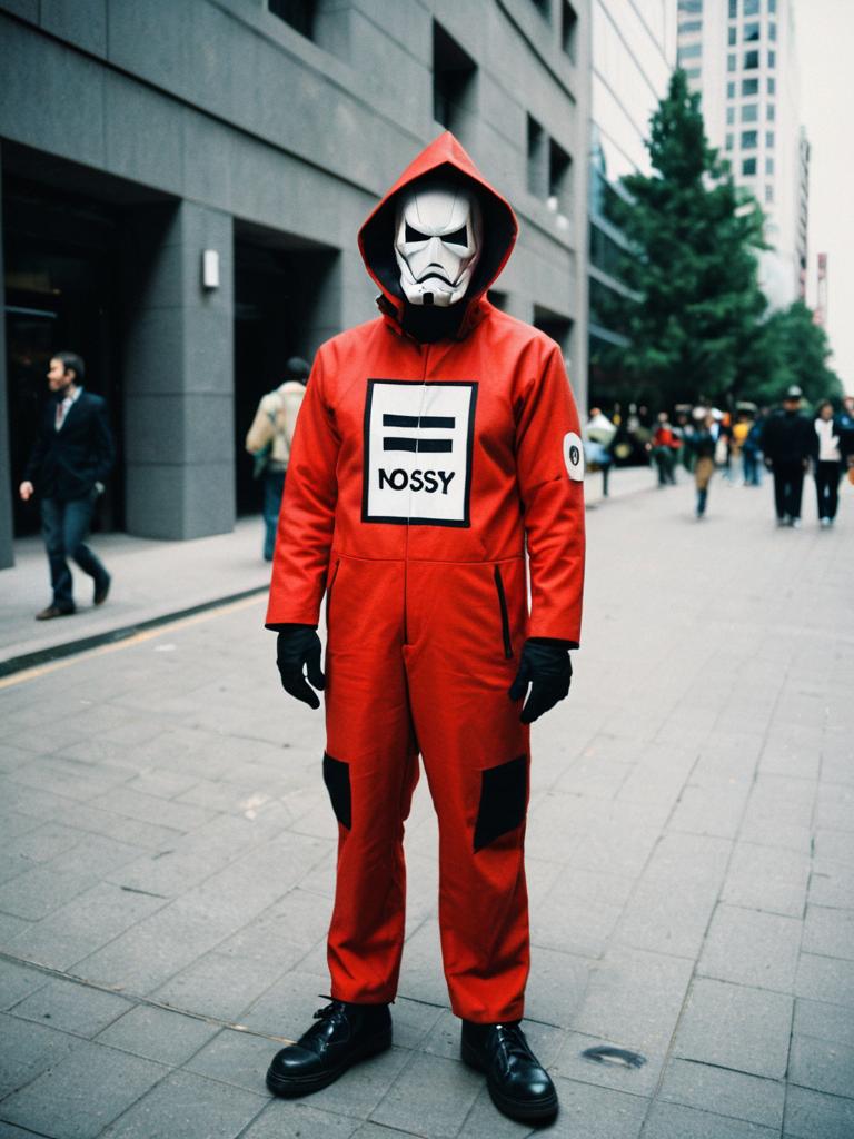 A man dressed in a distinctive Chopscotch cosplay costume walks on a city street. He wears a yellow hooded jacket and matching pants with black accents, black gloves, and a backpack. The costume includes a white mask featuring a skull design with sharp black eye slits and vertical mouth slits, topped with two large black horns, creating a striking and realistic cosplay look.