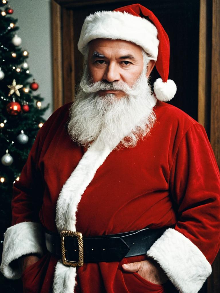 Victorian santa suit costume, 1boy, male focus, hat, solo, facial hair, santa hat, christmas, santa costume, looking at viewer, mustache, gloves, white gloves, jacket, upper body, red headwear, blurry, fur trim, belt, blurry background, beard, outdoors