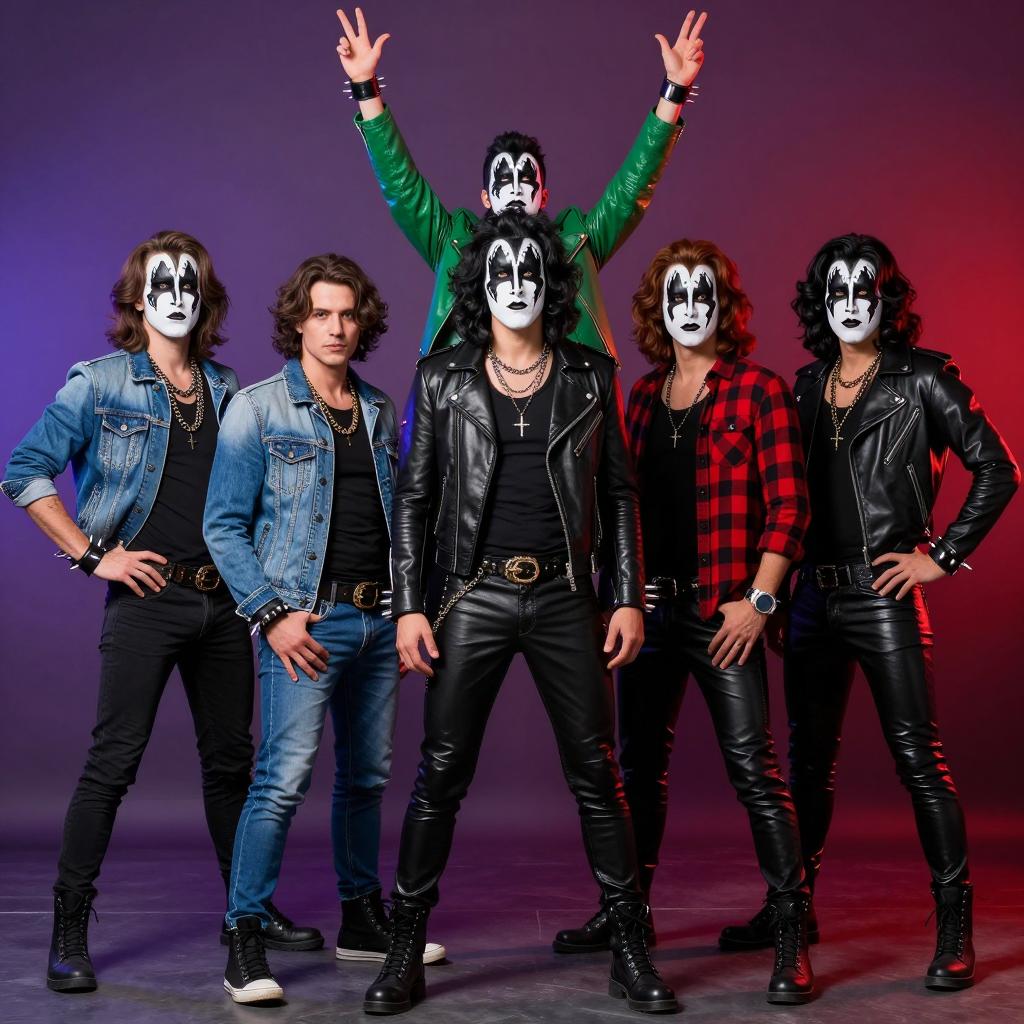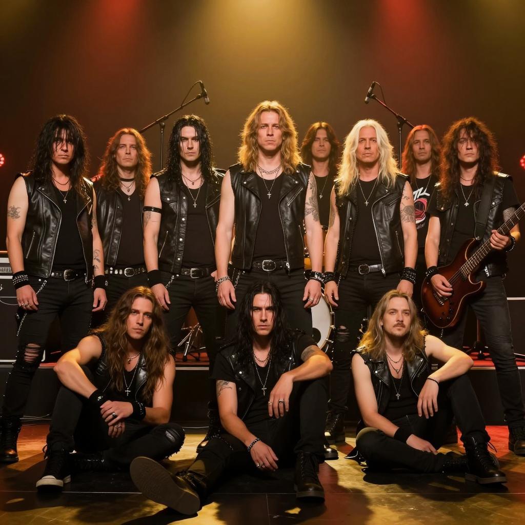 Rock band in dimly lit stage setting. Eleven members, mostly men, in leather vests, sleeveless shirts, and dark clothing. Various hairstyles, some long hair. Drum set, microphone stands, and red stage lights in background. Members in different poses: standing, sitting, leaning, and holding instruments. Intense facial expressions. Warm, yellow lighting.