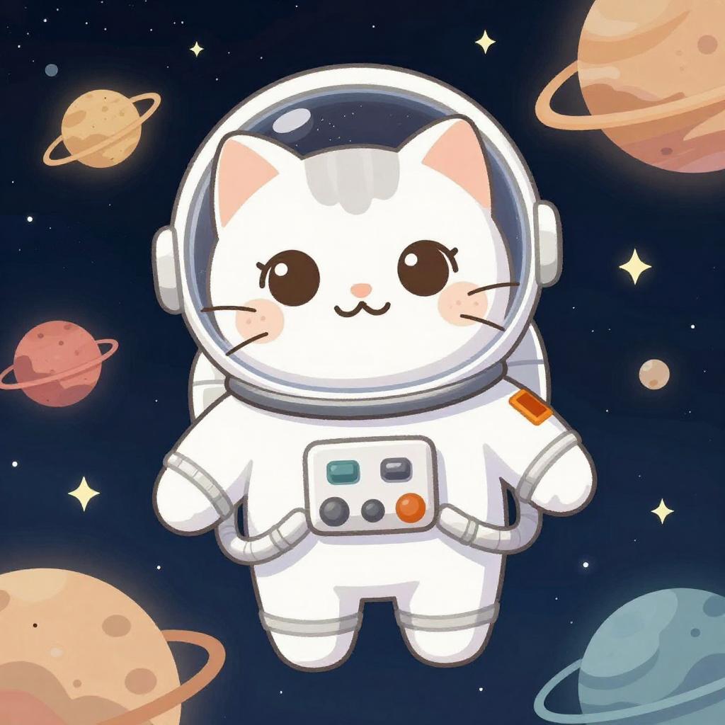Illustration of a cute white bunny with pink cheeks and inner ears floating in space surrounded by stars and orbits, featuring a dark blue starry background.
