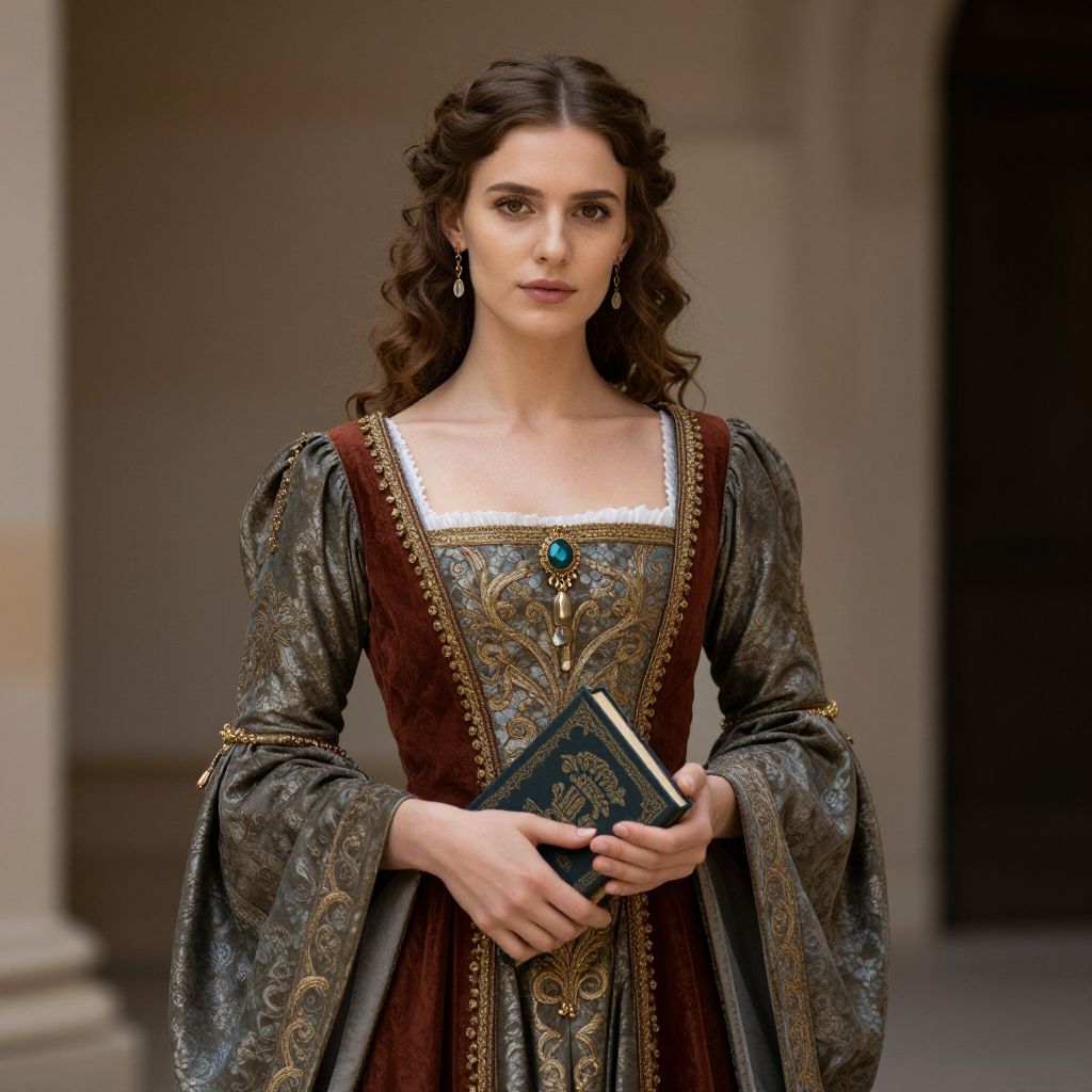 A woman in a luxurious medieval dress holds a book, exuding an air of elegance and knowledge.