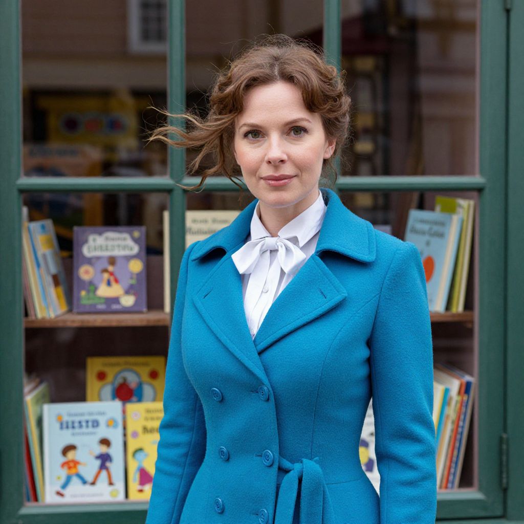 A detailed, realistic image of a Mary Poppins woman in a bright blue coat and traditional costume, standing in front of a vintage bookshop window with shelves of children's books, wind blowing gently in her curly hair, her face has a warm, motherly expression with soft brown features and a calm, gentle smile, the scene feels rich with storytelling and charm.. The woman has big tits and cute face